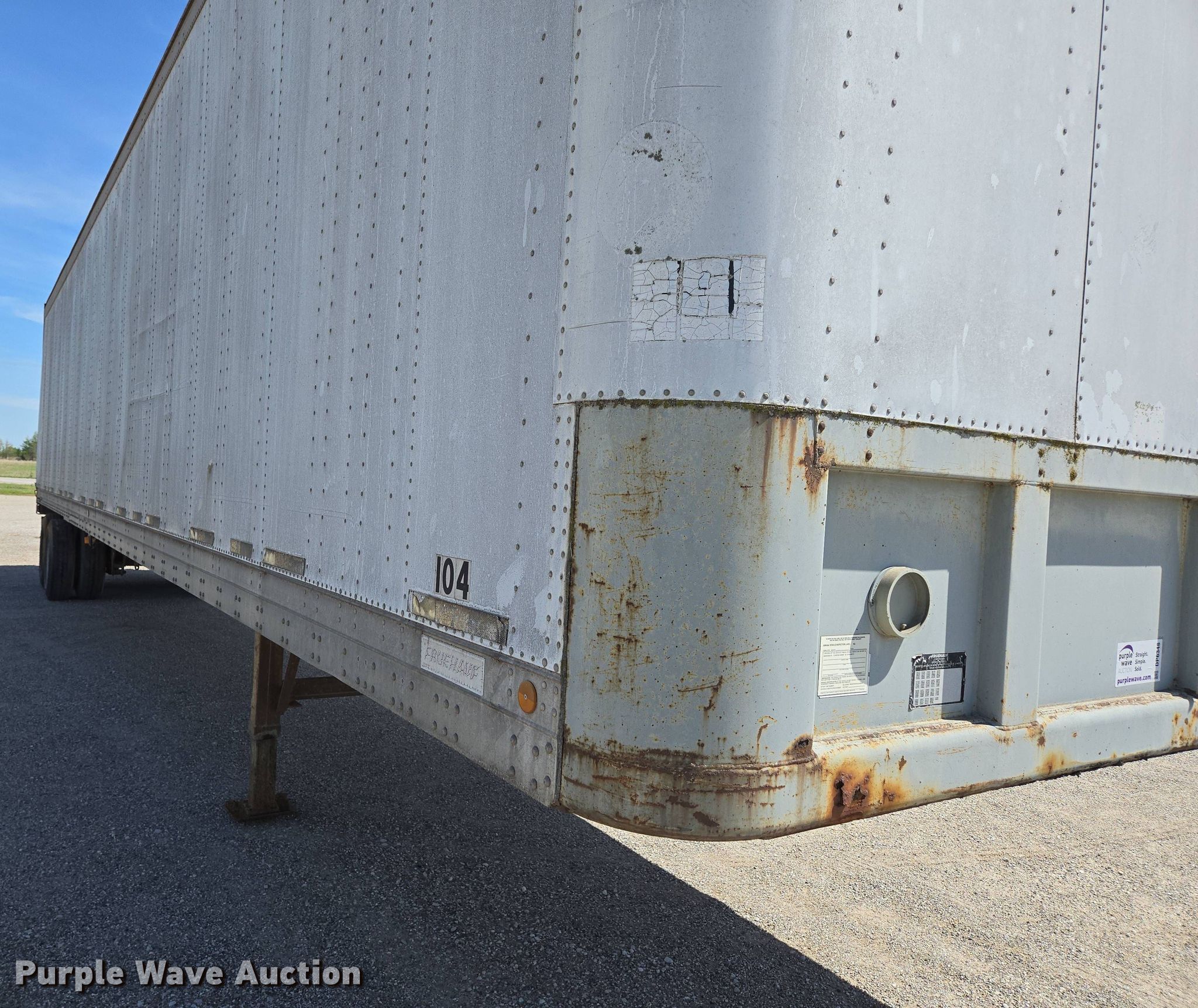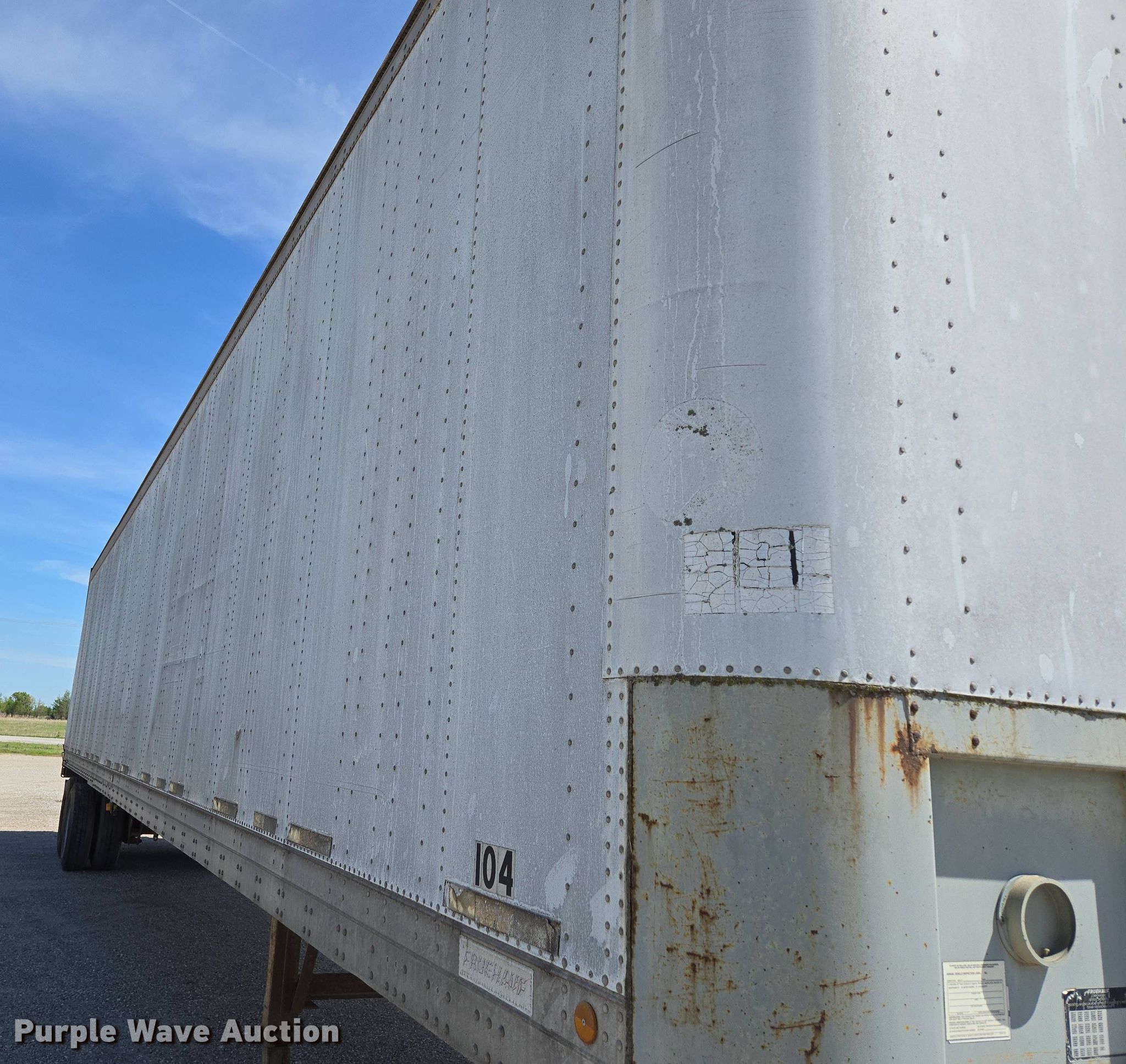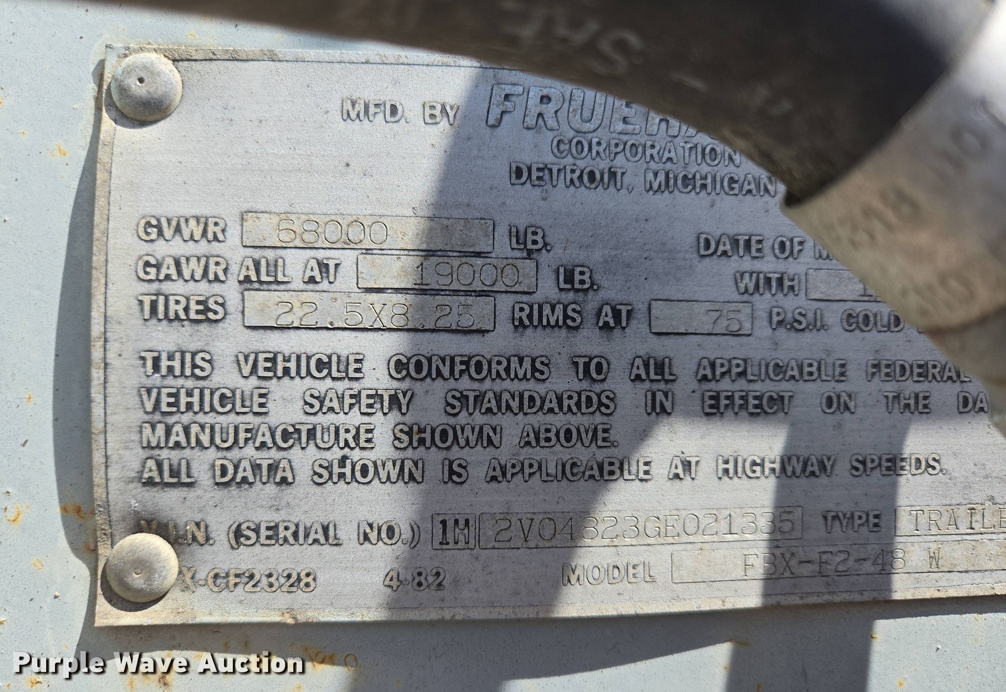 1986 Fruehauf FBX-F2-48 dry van trailer. VIN: 1H2V04823GE021335, Unit #: 104. Dimensions Overall: 48' L x 102" W, Rear door / ramp Width: 98.5". Features Deck type: Wood. Chassis Landing gear: Dual, Suspension: Spring, Brakes: Air, Axles: Tandem, GVWR: 68,000 lbs, GAWR: 19,000 lbs. Tires Steel wheels, Size: 295/75R22.5. Notes Rear doors damaged, Wall damage. Kansas title. Title distribution may be delayed up to 14 days from verification of funds. Farmer's Cooperative Assn. (Baxter Springs, KS). Baxter Springs, KS 66713