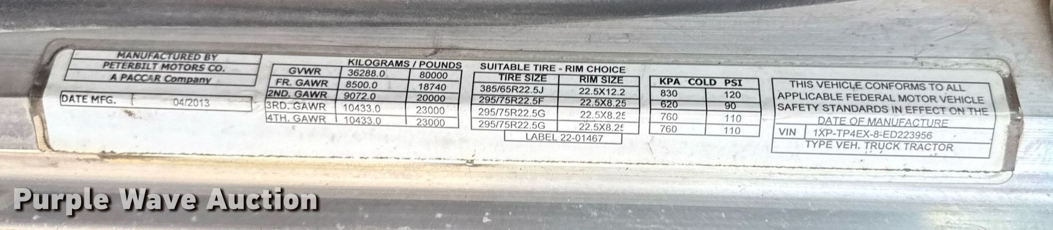 Purple Wave is selling a used Truck Tractor in Oklahoma. This item is a 2014 Peterbilt 367 semi truck with the following: Miles: 693,060 on odometer, VIN: 1XPTP4EX8ED223956