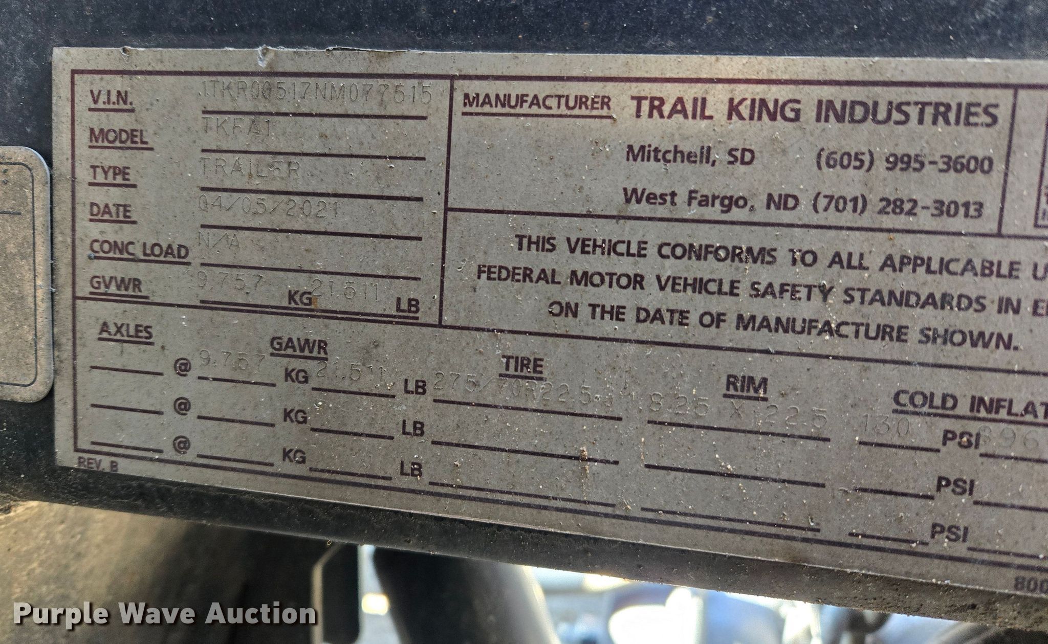 2022 Trail King TKFA1 flip axle. VIN: 1TKR00517NM077515, Unit #: T39. Dimensions Overall: 4' 6" L x 102" W. Features Deck type: Steel. Chassis Suspension: Air, Brakes: Air, GVWR: 21,511 lbs. Tires Aluminum wheels, Size: 275/70R22.5. Oklahoma title. Title has a lien that will be released following the close of the auction. Title distribution may be delayed up to 30 days from verification of funds. ARKK Trucking Inc. Sand Springs, OK 74063