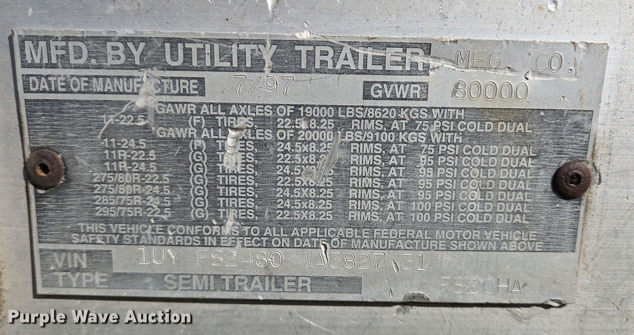 1998 Utility Trailers flatbed trailer. VIN: 1UYFS2480WA382731. Dimensions Overall: 47' 8" L x 98" W, Deck height: 58". Features Deck type: Aluminum, Wood. Chassis Landing gear: Dual, Suspension: Spring, Brakes: Air, Axles: Tandem Sliding, GVWR: 80,000 lbs, GAWR: 19,000 lbs. Tires Aluminum wheels, Size: 295/75R22.5. Notes Deck boards damaged, hole. Oklahoma title. Seller is a Texas licensed motor vehicle dealer. The buyer may be required to pay sales tax and/or registration fees to the dealer prior to taking possession. Title will be assigned and distributed by the dealer. Please contact the seller for distribution questions. Country Equipment Sales. Groveton, TX 75845