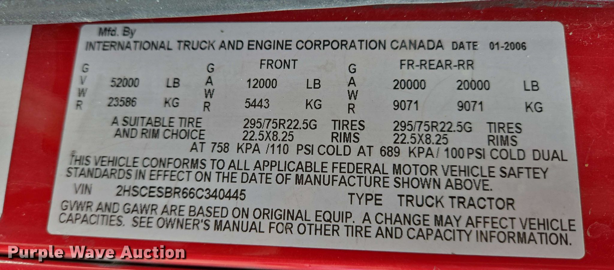 Purple Wave is selling a used Truck Tractor in Texas. This item is a 2006 International 9200i SBA semi truck with the following: Miles: 1,423,374 on odometer, Engine hours: 44,291 on meter, VIN: 2HSCESBR66C340445