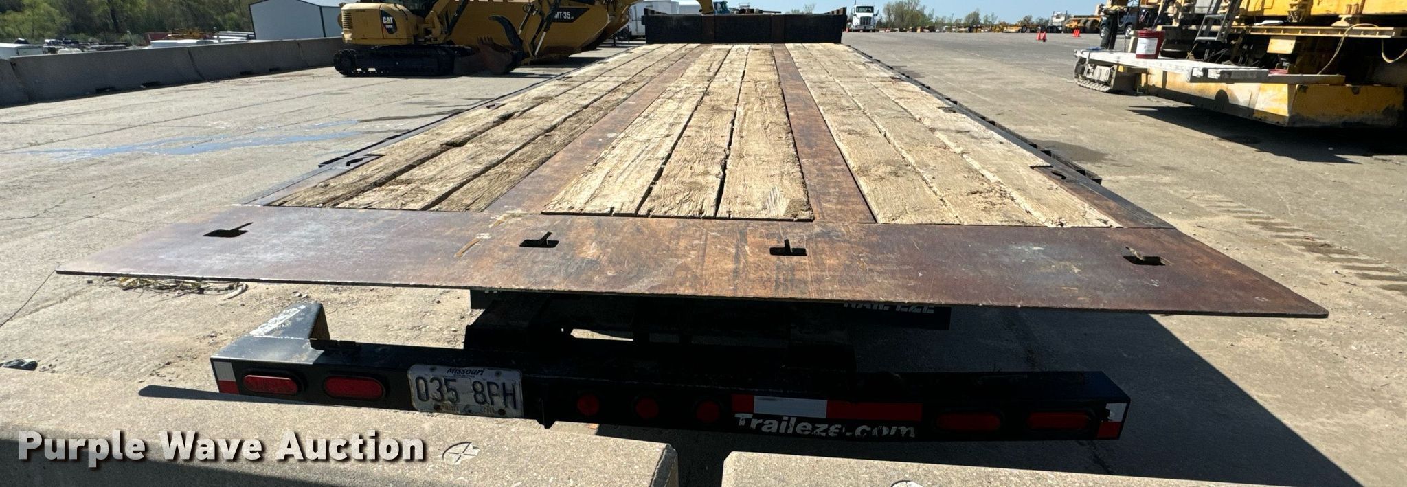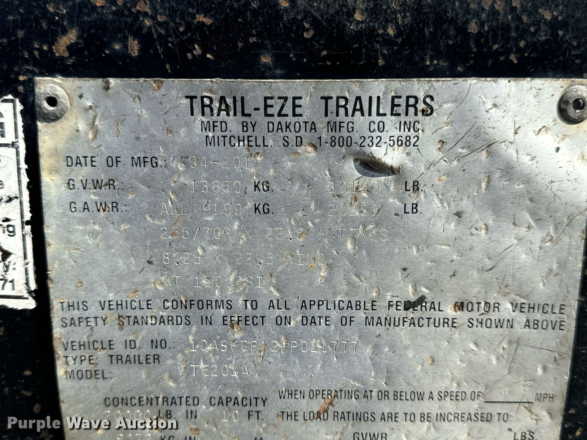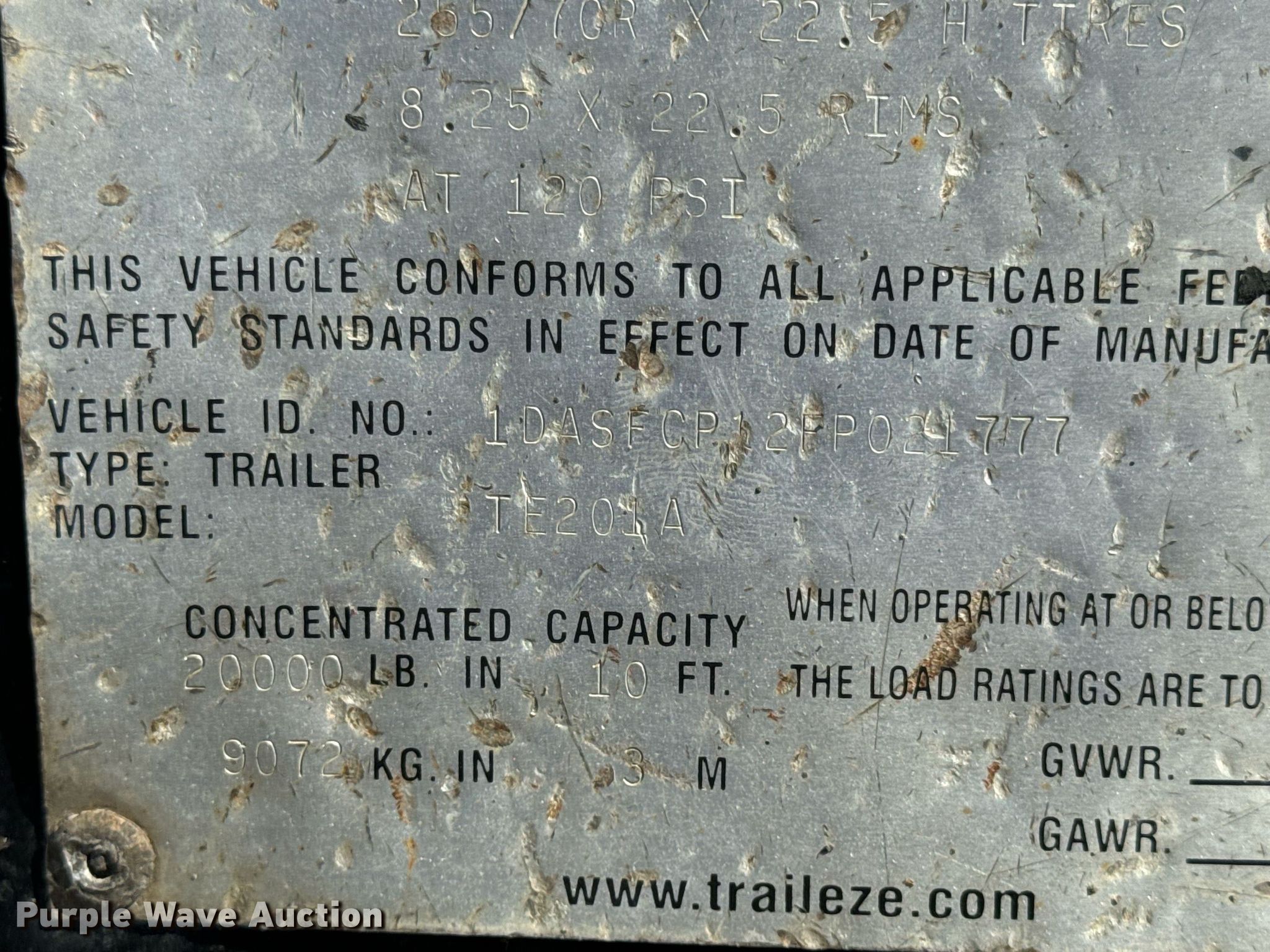 2015 Trail-Eze TE201A drop tilt deck equipment trailer. VIN: 1DASFCP12FP021777, Unit #: 87-793. Dimensions Overall: 34' 1" L x 102" W, Deck: 24' 3" L x 97" W, Top deck length: 91'. Features Deck type: Wood, Winch Model: AHGU2-10F. Chassis Landing gear: Dual, Suspension: Air, Brakes: Air, Sliding, GVWR: 30,100 lbs, GAWR: 20,280 lbs. Tires Aluminum wheels, Size: 445/50R22.5. Notes Latch issues, need replaced, Clamp issues, needs replaced, Non-operational landing gear. Missouri title. Title distribution may be delayed up to 30 days from verification of funds. Emery Sapp & Sons, Inc.. Columbia, MO 65202