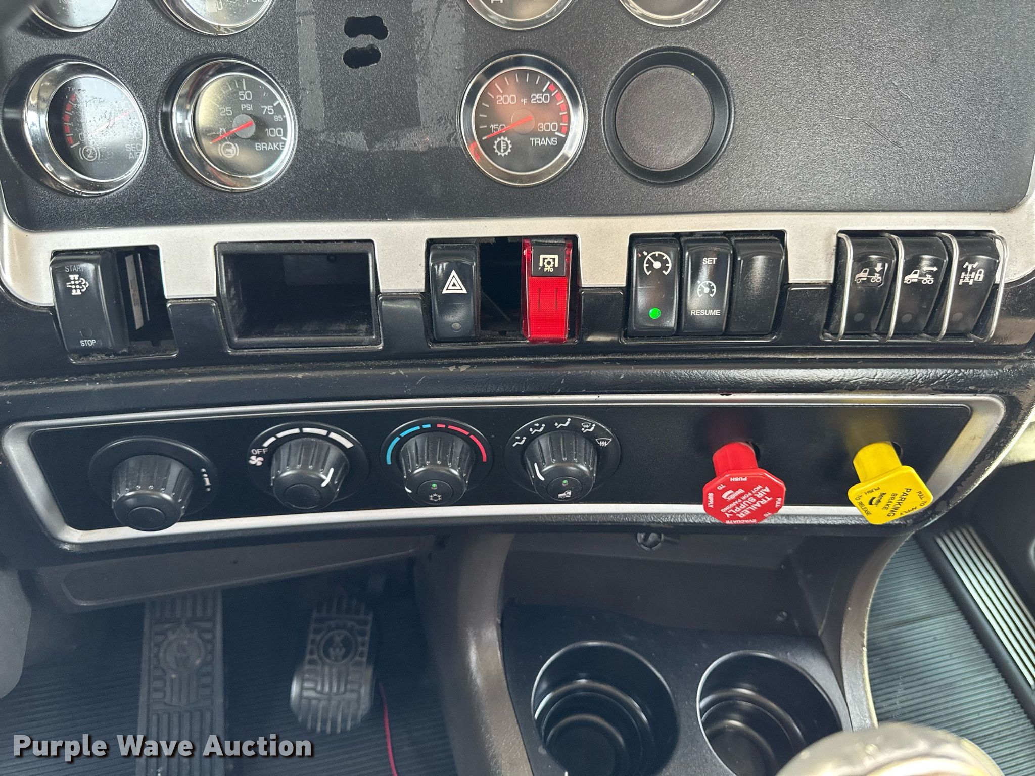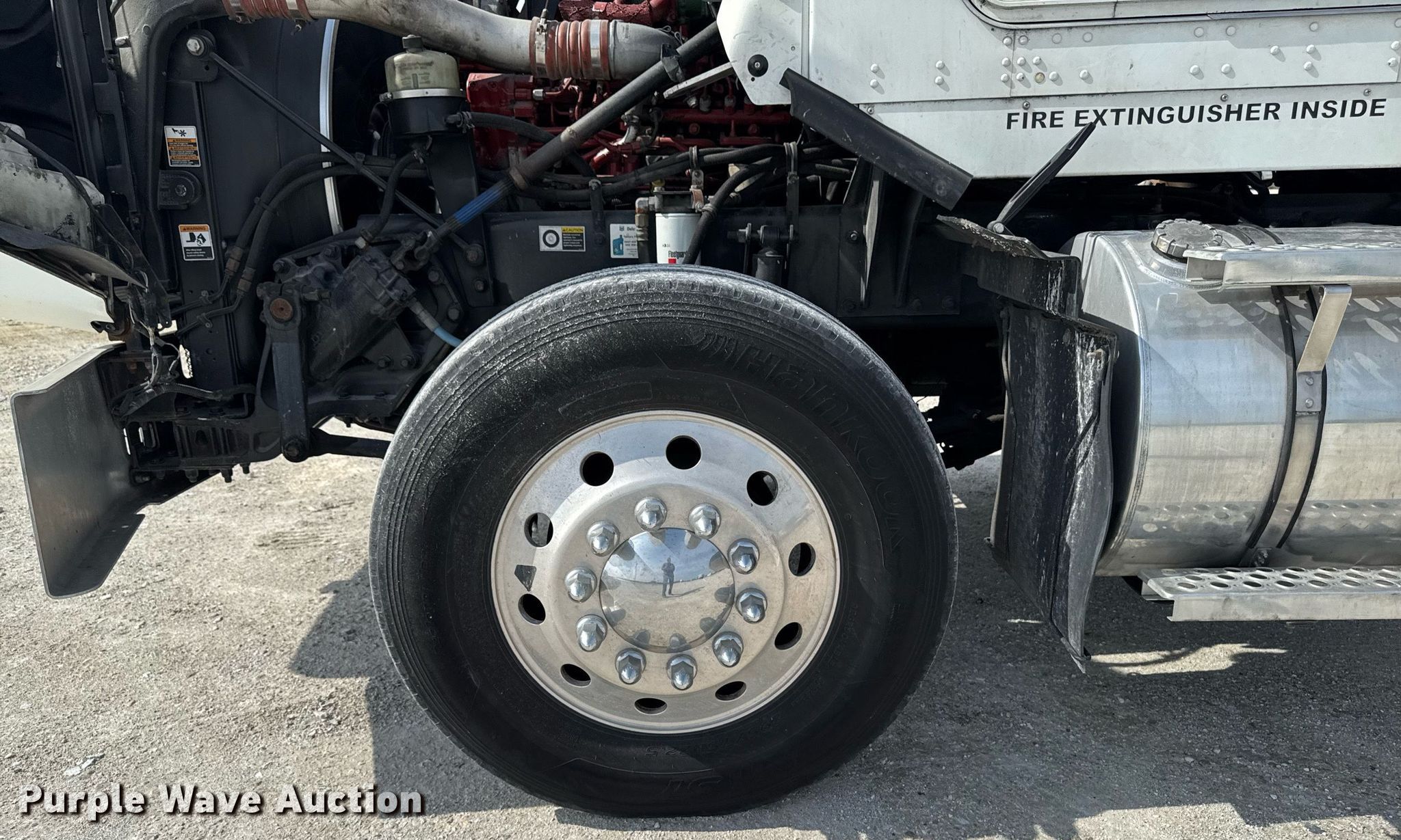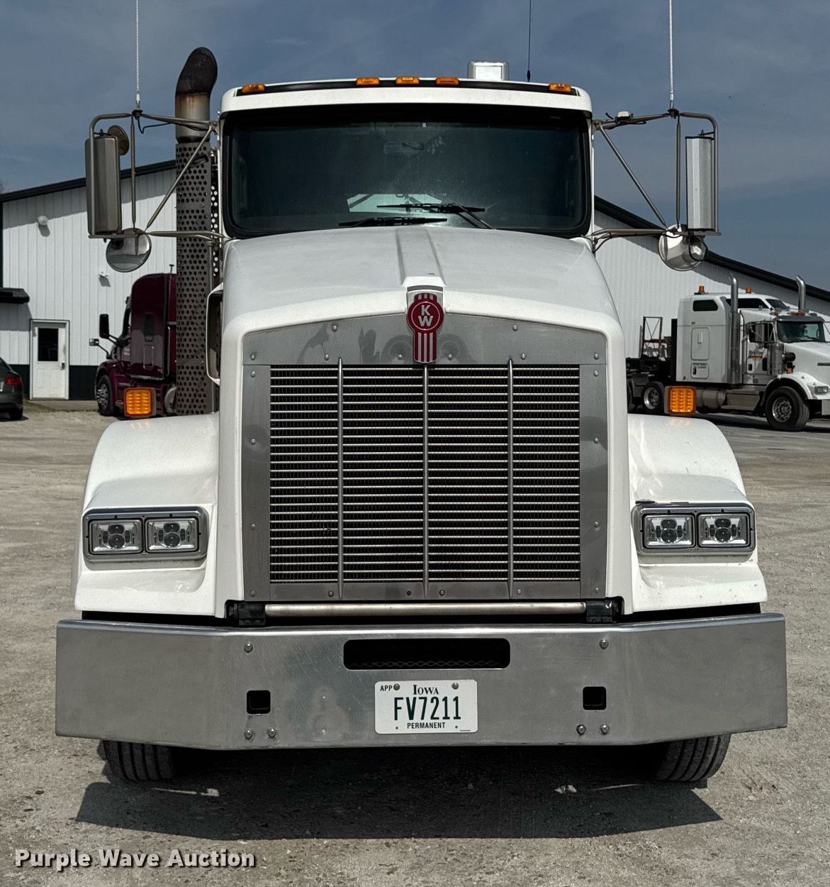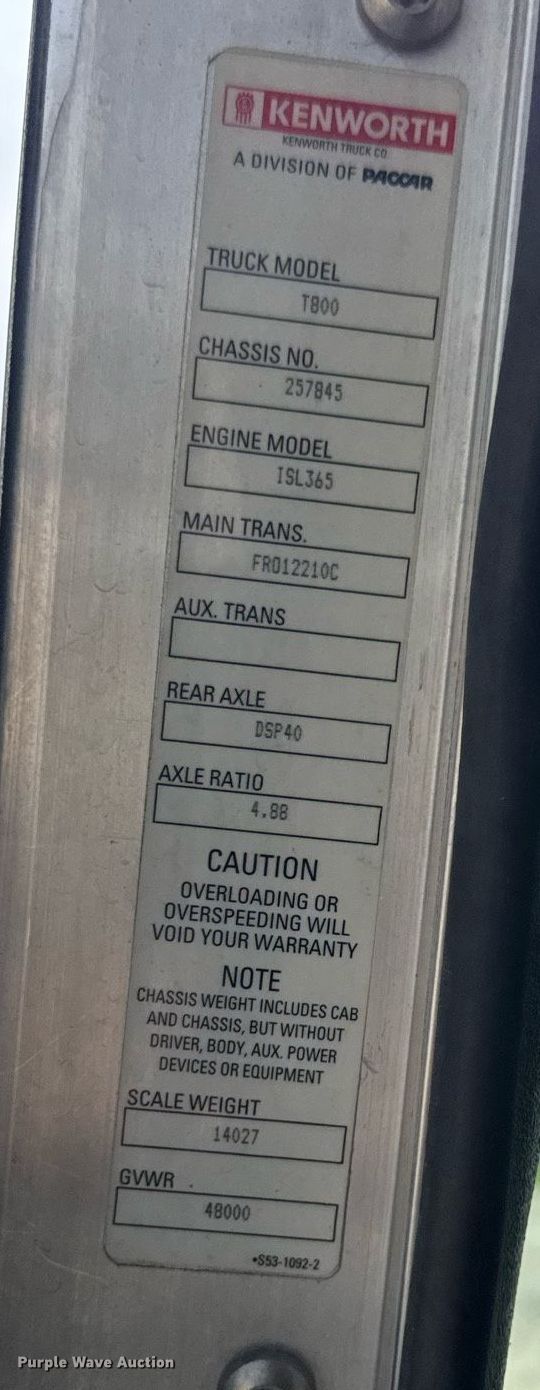 2009 Kenworth T800 semi truck. Miles: 363,036 on odometer, Hours: 17,958 on meter, VIN: 1XKDD59XX9R257845. Engine Cummins, Displacement: 8.9L, Cylinders: 6, Fuel type: Diesel, HP: 310. Transmission Eaton Fuller, Manual, Speed: 10. Chassis Axles: Tandem, Differential lock: Inter-axle, Suspension: Air Dump valves, Brakes: Air, PTO, Truck chassis: 175", GVWR: 48,000 lbs FAWR: 12,000 lbs, IAWR: 18,000 lbs, RAWR: 18,000 lbs. Interior AC, Heat, Power windows, Power locks, Cruise control, Air ride cab. Features Deck plate: Aluminum, Fifth wheel type: Air operated, Sliding, Fuel tank: Single. Tires Size: 295/75R22.5. Notes Dash warning indicator: Brake. Iowa title. Title distribution may be delayed up to 14 days from verification of funds. Straitline Transportation. Biggsville, IL 61418