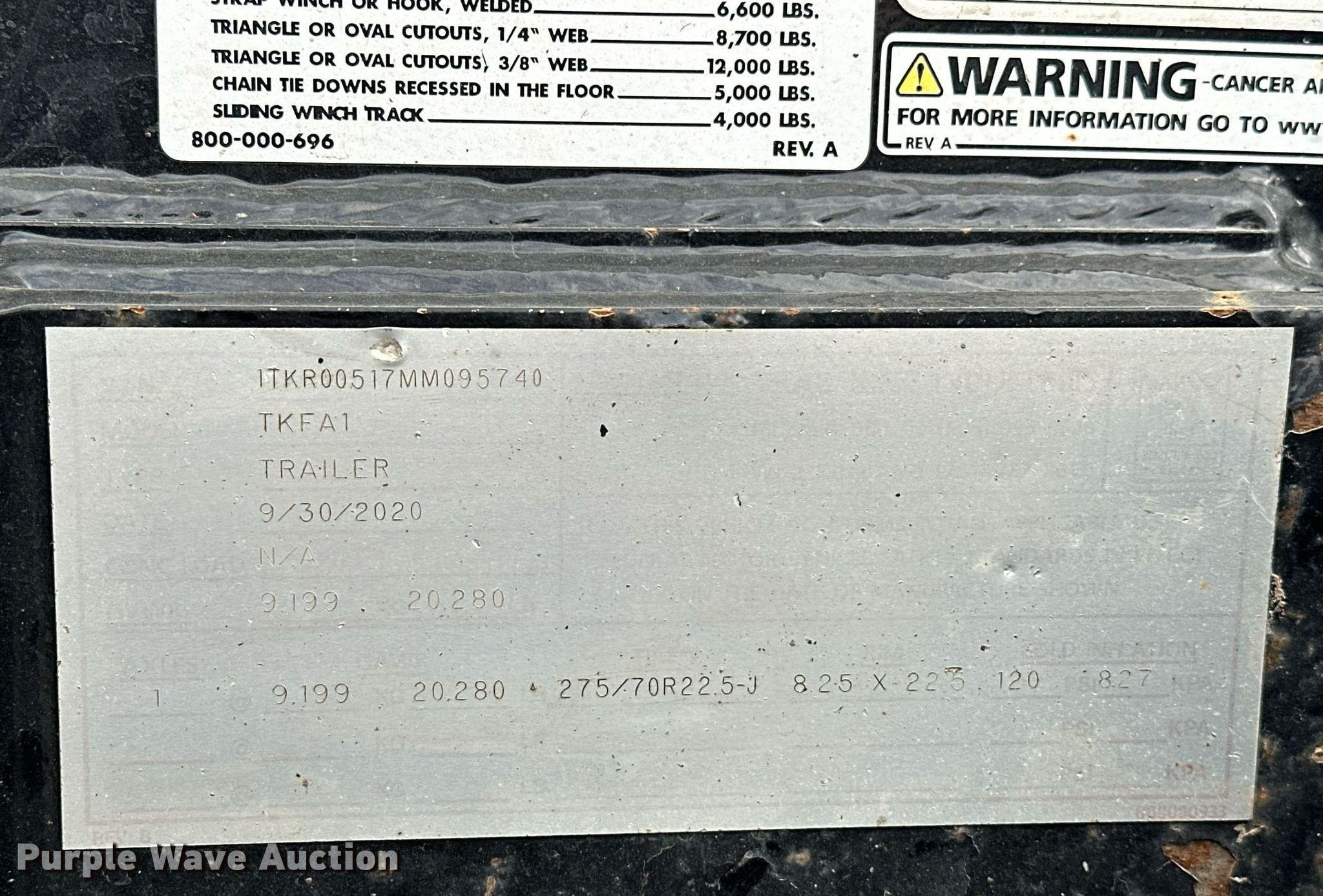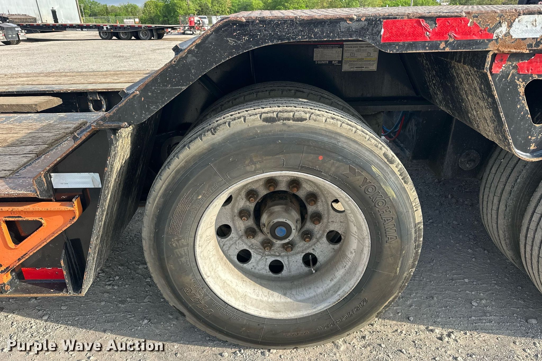 2021 Trail King TK110HDC lowboy equipment trailer. VIN: 1TKJ05338MM085264. Dimensions Overall: 53' L x 108" W, Deck: 28' 4" L x 108" W, Rear deck length: 11' 8", Deck height: 30". Features Deck type: Steel, Wood, Outriggers: Swing-out, Pull-out Board size: 12", Neck type: Detachable, Self-contained hydraulics, Hydraulic controls: Manual. Chassis Suspension: Air, Brakes: Air, Axles: Triple, GVWR: 110,000 lbs, GAWR: 20,280 lbs. Tires Aluminum wheels, Size: 275/70R22.5. 2021 Trail King TKFA1 flip axle VIN: 1TKR00517MM095740. Chassis Axles: Single, Suspension: Air, Brakes: Air. Tires Aluminum wheels, Size: 275/70R22.5. Trailer- Oklahoma title. Axle - Oklahoma title. Title has a lien that will be released following the close of the auction. Title distribution may be delayed up to 30 days from verification of funds. ARKK Trucking, Inc.. Sand Springs, OK 74063