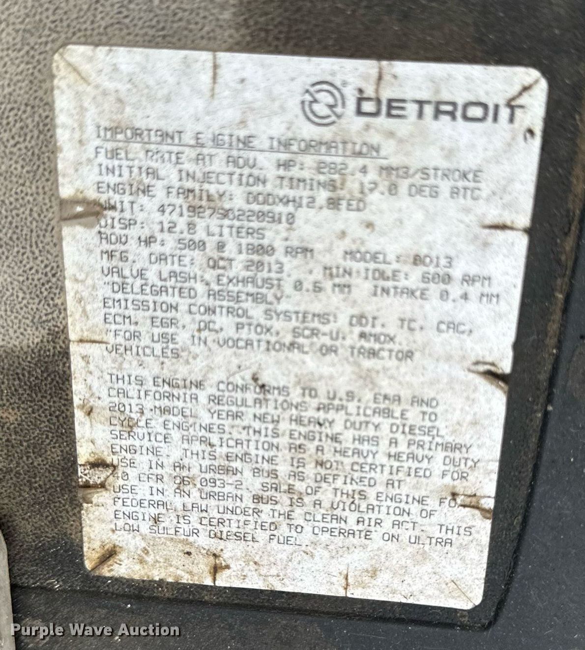2014 Freightliner Coronado SD 122 semi truck. Miles: 720,864 on odometer, Hours: 12,887 on meter, VIN: 3AKJGNDV7EDFT2939, Unit #: 939. Engine Detroit Diesel DD13, Displacement: 12.8L, Cylinders: 6, Fuel type: Diesel, HP: 500, Engine brake. Transmission Freightliner, Manual, Speed: 10. Chassis Axles: Tandem, Differential lock: Inter-axle, Suspension: Air Dump valves, Brakes: Air, PTO, Wet kit, GVWR: 52,000 lbs. Interior AC, Heat, Heated mirrors, Power windows, Cruise control, Air ride cab. Features Deck plate: Aluminum, Fifth wheel type: Air operated, Sliding, Fuel tank: Single. Tires Size: 11R22.5. Notes Dash warning indicator: ABS. View repairs. Minnesota title. Title distribution may be delayed up to 30 days from verification of funds. A Dahl Trucking Inventory Reduction - Open Inspection May 23rd. Elmore, MN 56027