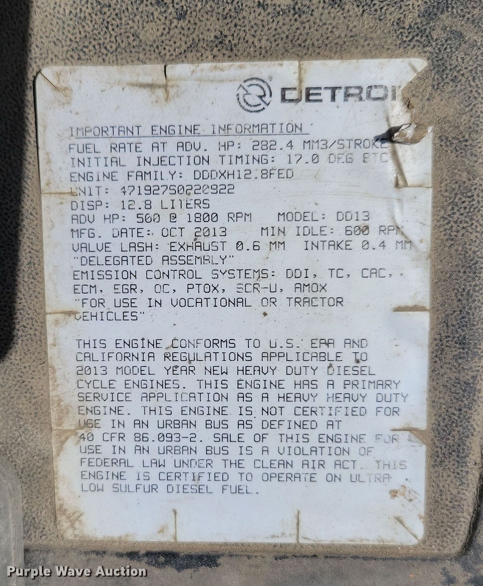 2014 Freightliner Coronado SD 122 semi truck. VIN: 3AKJGNDV5EDFT2938, Unit #: 938. Engine Detroit Diesel DD13, Displacement: 12.8L, Cylinders: 6, Fuel type: Diesel, Engine brake. Transmission Eaton Fuller, Manual, Speed: 10. Chassis Axles: Tandem, Differential lock: Inter-axle, Suspension: Air Dump valves, Brakes: Air, PTO, Wet kit. Interior AC, Heat, Heated mirrors, Power windows, Cruise control, Air ride cab. Features Deck plate: Aluminum, Fifth wheel type: Air operated, Sliding, Fuel tank: Dual. Tires Size: 11R22.5. Notes Fuel tank damaged, Dash warning indicator: Low DEF. View repairs. Minnesota title. Title distribution may be delayed up to 30 days from verification of funds. A Dahl Trucking Inventory Reduction - Open Inspection May 23rd. Elmore, MN 56027