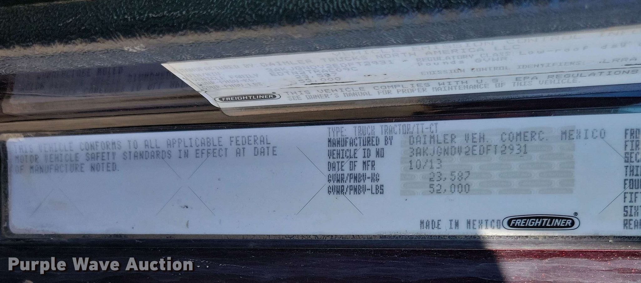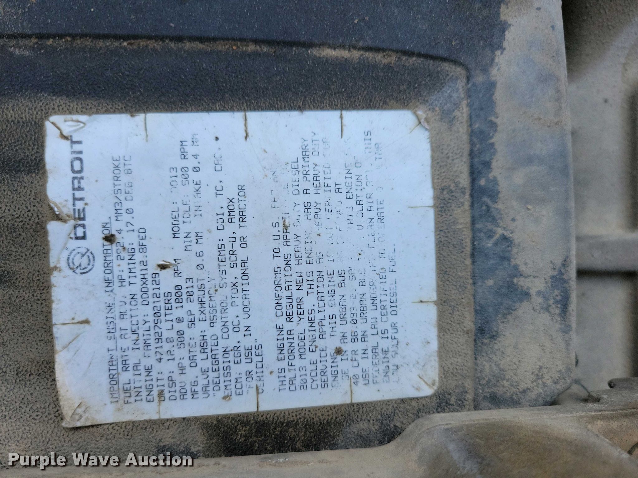 2014 Freightliner Coronado semi truck. Miles: 786,611 on odometer, VIN: 3AKJGMDV2EDFT2931, Unit #: 931. Engine Detroit Diesel DD13, Displacement: 12.8L, Cylinders: 6, Fuel type: Diesel, Engine brake. Transmission Eaton Fuller, Manual, Speed: 10. Chassis Axles: Tandem, Differential lock: Inter-axle, Suspension: Air Dump valves, Brakes: Air, PTO, Wet kit, GVWR: 52,000 lbs FAWR: 12,000 lbs, IAWR: 20,000 lbs, RAWR: 20,000 lbs. Interior AC, Heat, Heated mirrors, Power windows, Cruise control, Air ride cab. Features Deck plate: Aluminum, Fifth wheel type: Air operated, Sliding, Fuel tank: Dual. Tires Size: 11R22.5. Notes Dash warning indicator: Low DEF, Windshield chipped or cracked. View repairs. Minnesota title. Title distribution may be delayed up to 30 days from verification of funds. A Dahl Trucking Inventory Reduction - Open Inspection May 23rd. Elmore, MN 56027