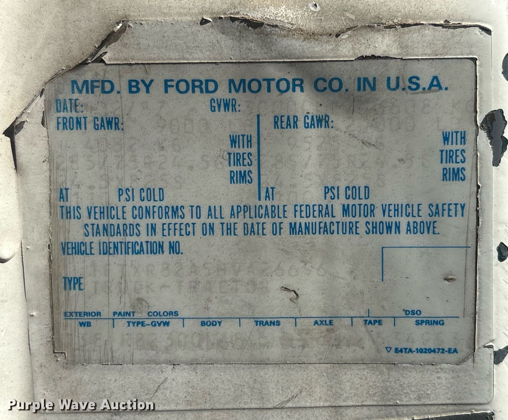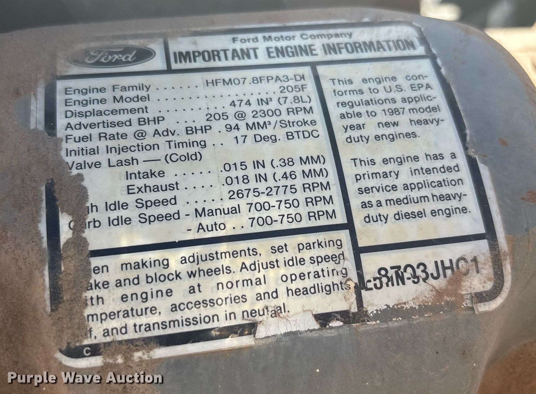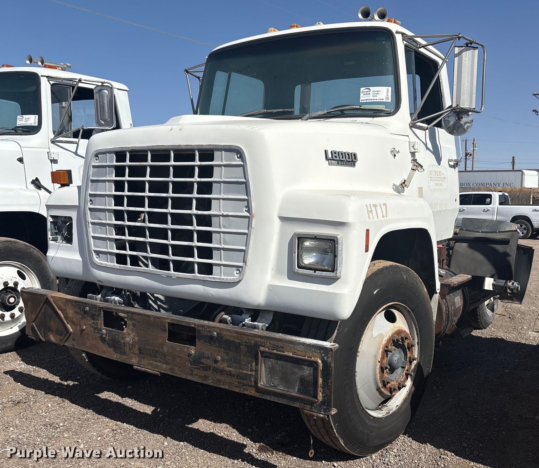1987 Ford L8000 semi truck. Miles: 138,713 on odometer, VIN: 1FTXR82A5HVA26696. Engine Ford 205F, Displacement: 7.8L, Cylinders: 6, Fuel type: Diesel, HP: 205. Transmission Manual, Speed: 5, plus 2. Chassis Axles: Single, Suspension: Spring, Brakes: Air, PTO Hours: 1,226 on meter, Truck chassis: 9' 4", GVWR: 30,000 lbs FAWR: 9,000 lbs, RAWR: 21,000 lbs, Wheelbase: 138". Features Fifth wheel type: Fixed, Fuel tank: Dual. Tires Size: 285/75R24.5. Notes Batteries missing, Radiator missing, Unknown operating condition. Kansas title. Title distribution may be delayed up to 14 days from verification of funds. Dustrol Inc.. El Paso, TX 79936