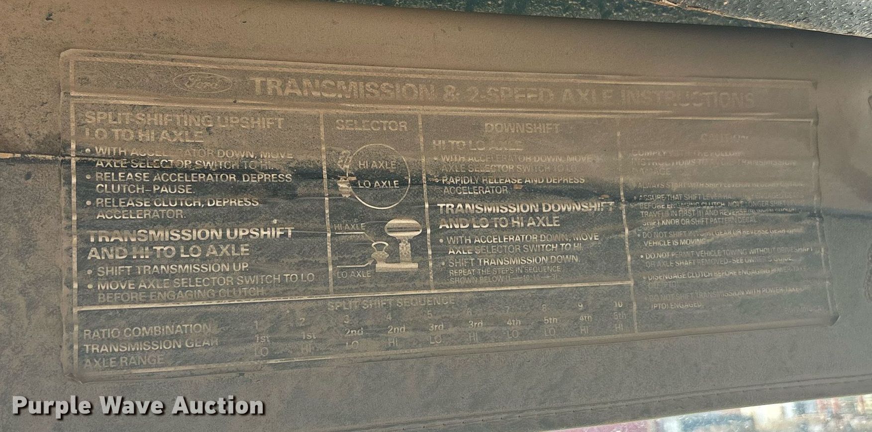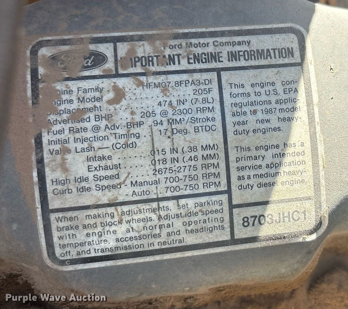 1987 Ford LN8000 semi truck. Miles: 166,259 on odometer, VIN: 1FTXR82A4HVA34191. Engine Ford 205F, Displacement: 7.8L, Cylinders: 6, Fuel type: Diesel, HP: 205. Transmission Manual, Speed: 5, plus 2. Chassis Axles: Single, Suspension: Spring, Brakes: Air, PTO Hours: 812 on meter, Truck chassis: 9' 4", GVWR: 30,000 lbs FAWR: 9,000 lbs, RAWR: 21,000 lbs, Wheelbase: 138". Features Fifth wheel type: Fixed, Fuel tank: Dual. Tires Size: 285/75R24.5. Notes Batteries missing, Unknown operating condition. Kansas title. Title distribution may be delayed up to 14 days from verification of funds. Dustrol Inc.. El Paso, TX 79936