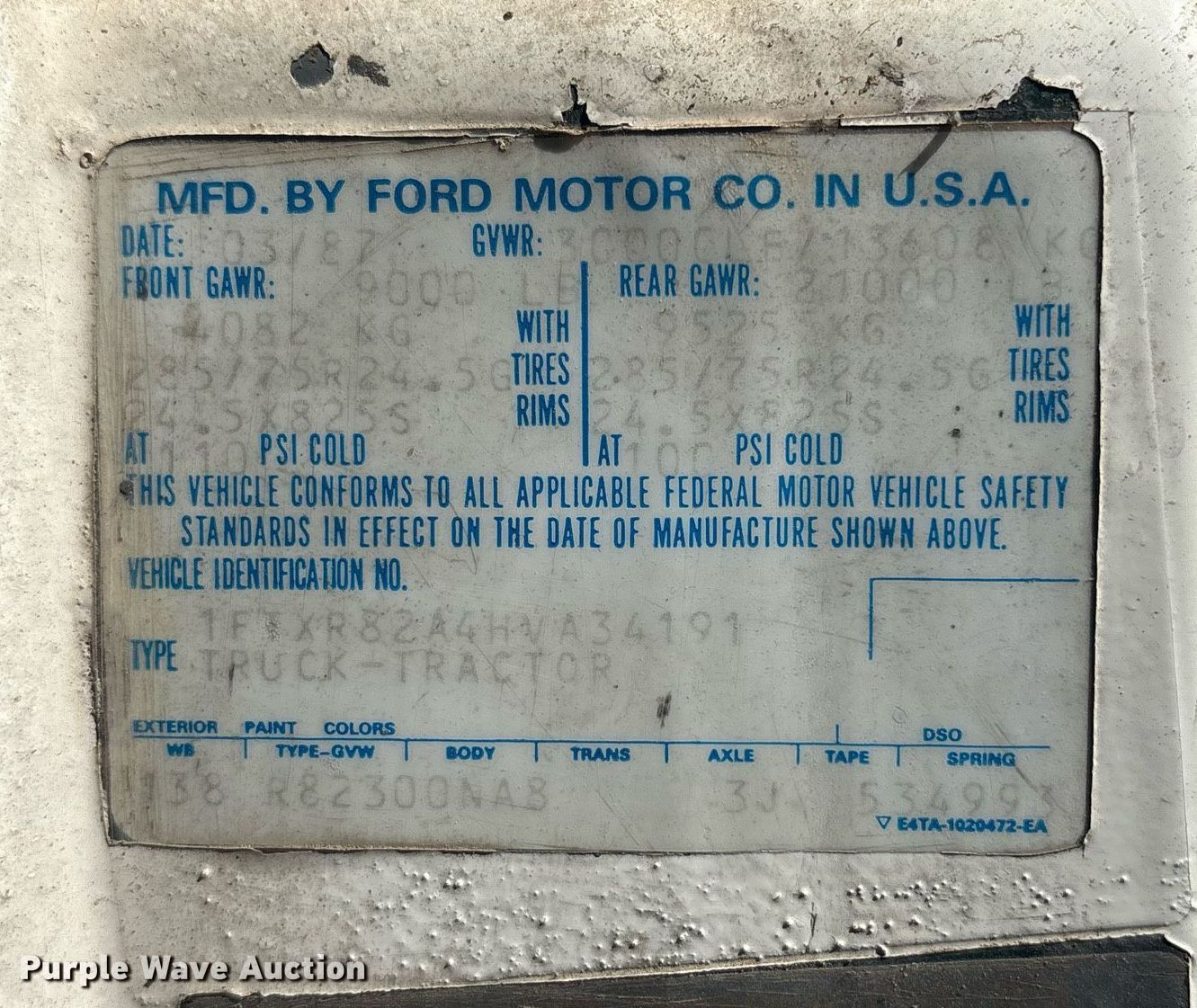 Purple Wave is selling a used Truck Tractor in Texas. This item is a 1987 Ford LN8000 semi truck with the following: Miles: 166,259 on odometer, VIN: 1FTXR82A4HVA34191