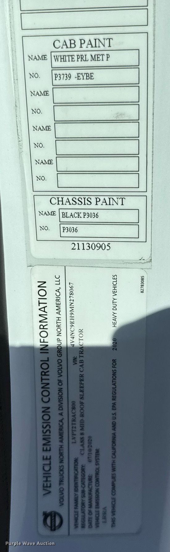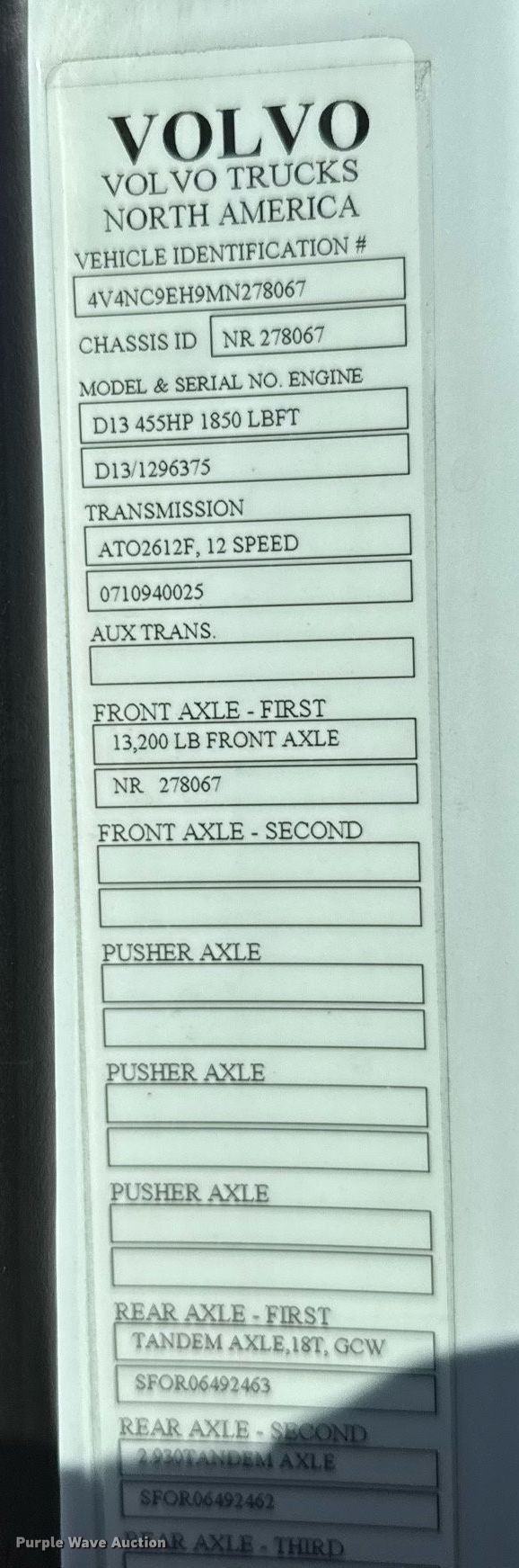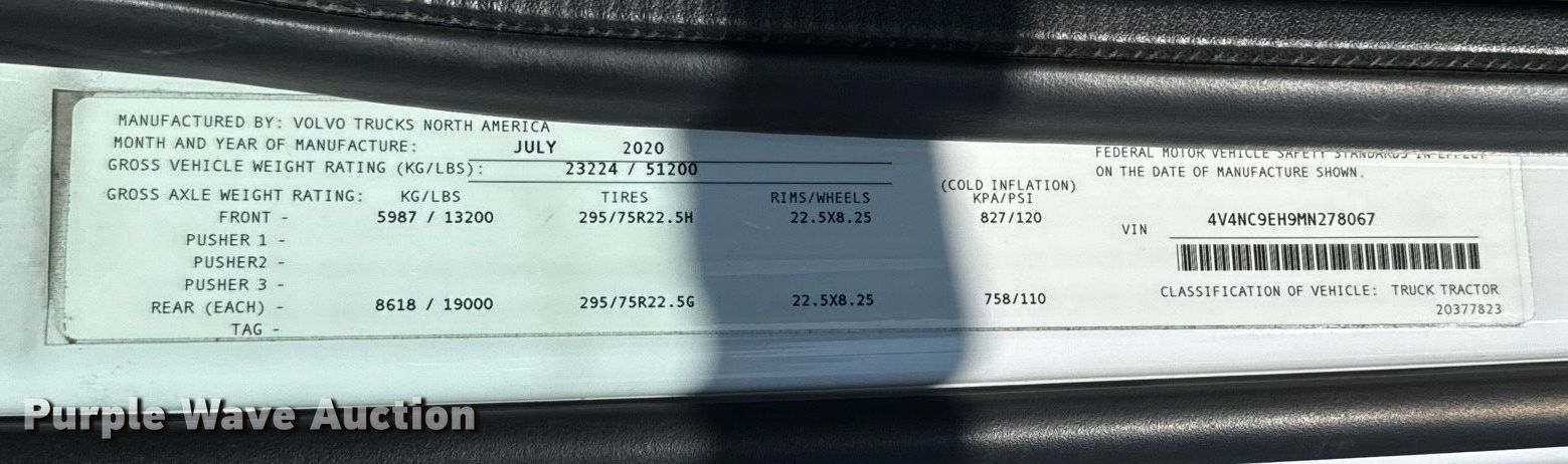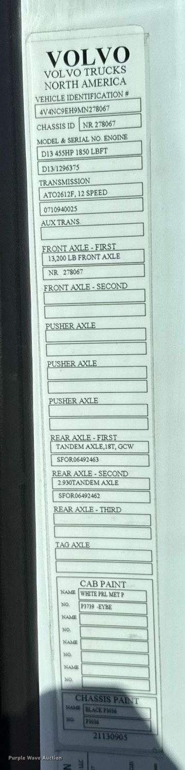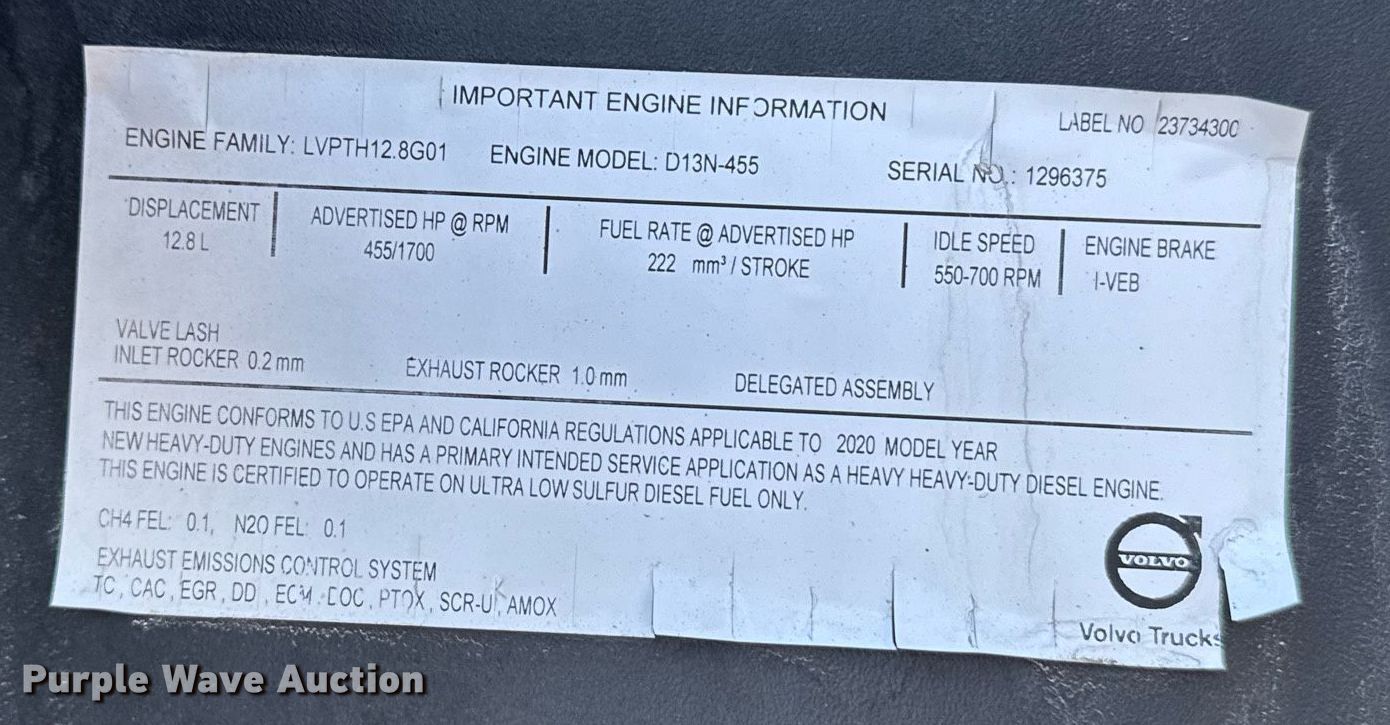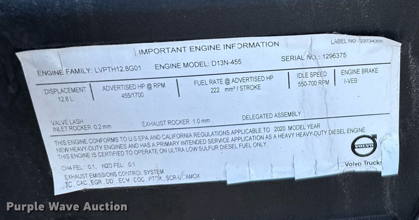 2021 Volvo VNL semi truck. Miles: 496,183 on odometer, Hours: 10,453 on meter, VIN: 4V4NC9EH9MN278067. Engine Volvo D13N-455, Serial: 1296375, Displacement: 12.8L, Cylinders: 6, Fuel type: Diesel, HP: 455, Engine brake. Transmission Volvo I-Shift, Automated manual. Chassis Axles: Tandem, Differential lock: Inter-axle, Suspension: Air Dump valves, Brakes: Air, GVWR: 51,200 lbs FAWR: 13,200 lbs, IAWR: 19,000 lbs, RAWR: 19,000 lbs. Interior AC, Heat, Heated mirrors, Power windows, Power locks, Cruise control, Air ride cab, Sleeper Sleeper length: 72", Refrigerator, Auxiliary power unit TriPac Evolution. Features Deck plate: Aluminum, Fifth wheel type: Air operated, Hydraulic lift, Fuel tank: Dual. Tires Size: 295/75R22.5. Kansas title. Title distribution may be delayed up to 14 days from verification of funds. Great Plains Trucking Inc.. Salina, KS 67401
