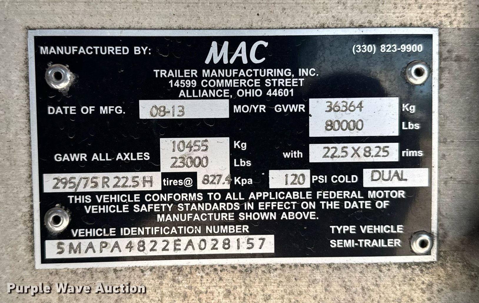 Purple Wave is selling a used Flat or Drop Deck Trailer in Kansas. This item is a 2014 Mac flatbed trailer with the following: VIN: 5MAPA4822EA028157
