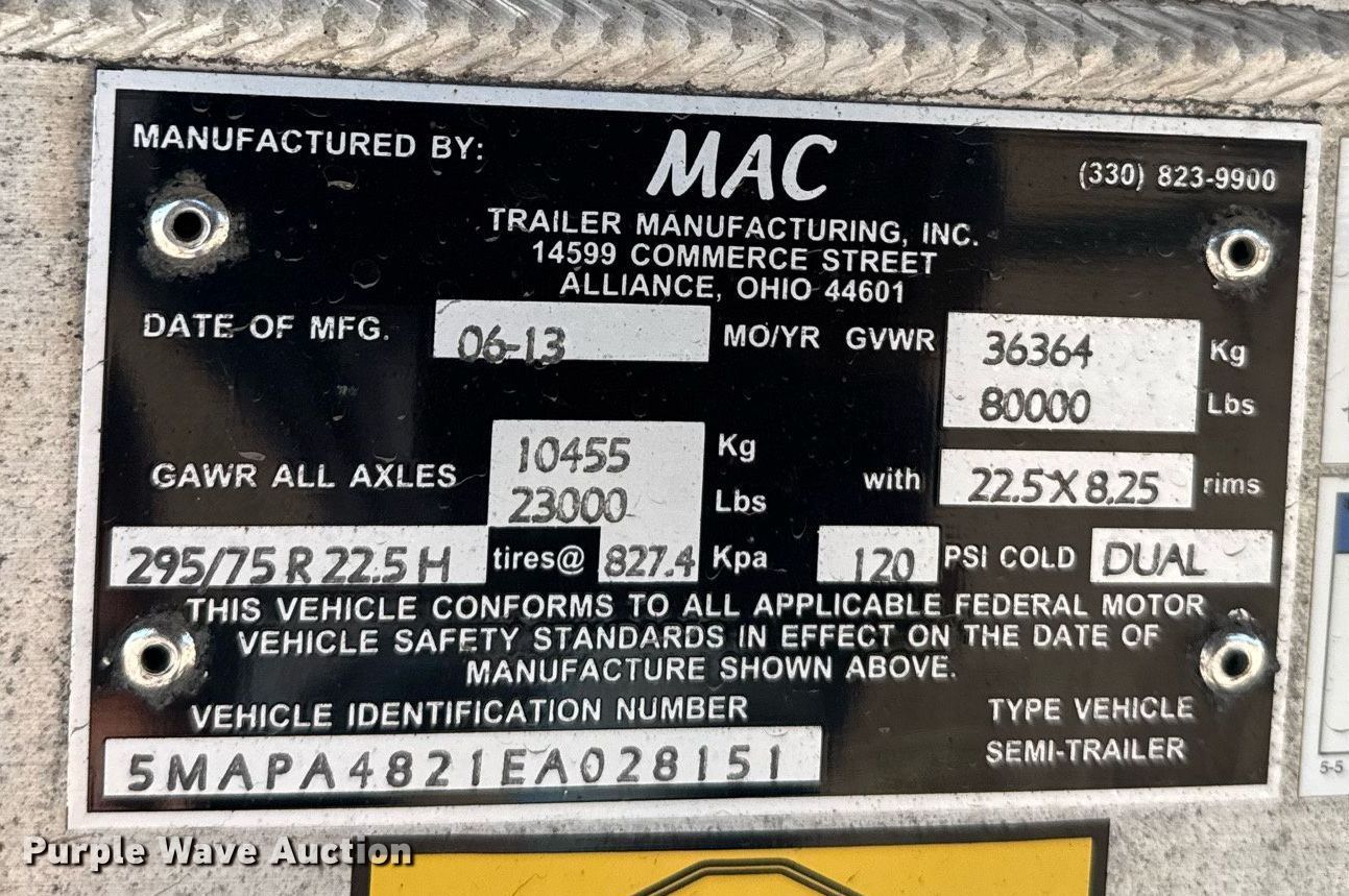 Purple Wave is selling a used Flat or Drop Deck Trailer in Kansas. This item is a 2014 Mac flatbed trailer with the following: VIN: 5MAPA4821EA028151
