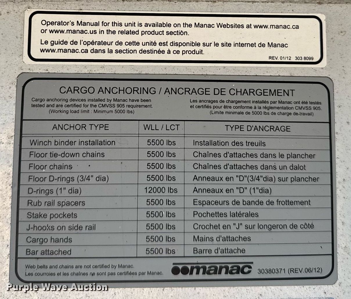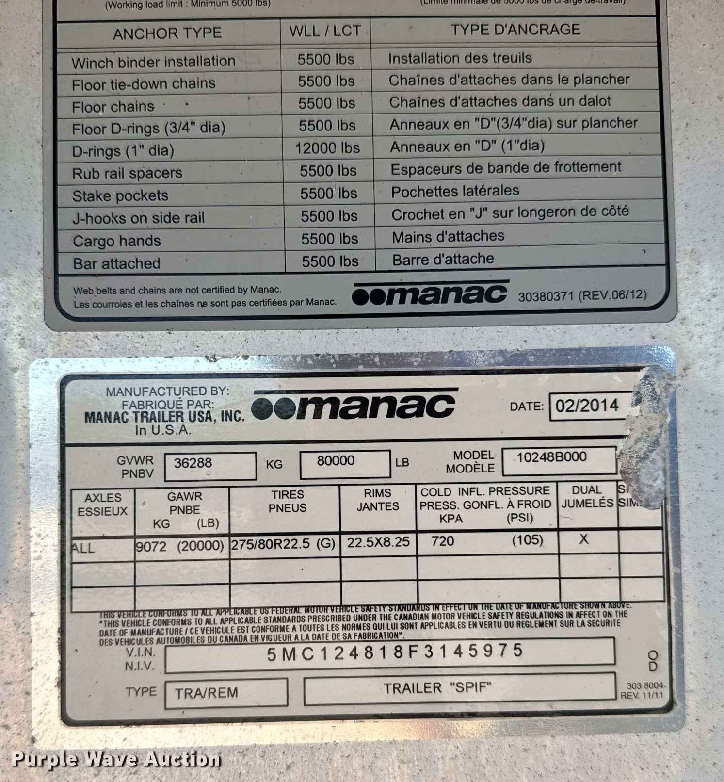 Purple Wave is selling a used Flat or Drop Deck Trailer in Kansas. This item is a 2015 Manac flatbed trailer with the following: VIN: 5MC124818F3145975