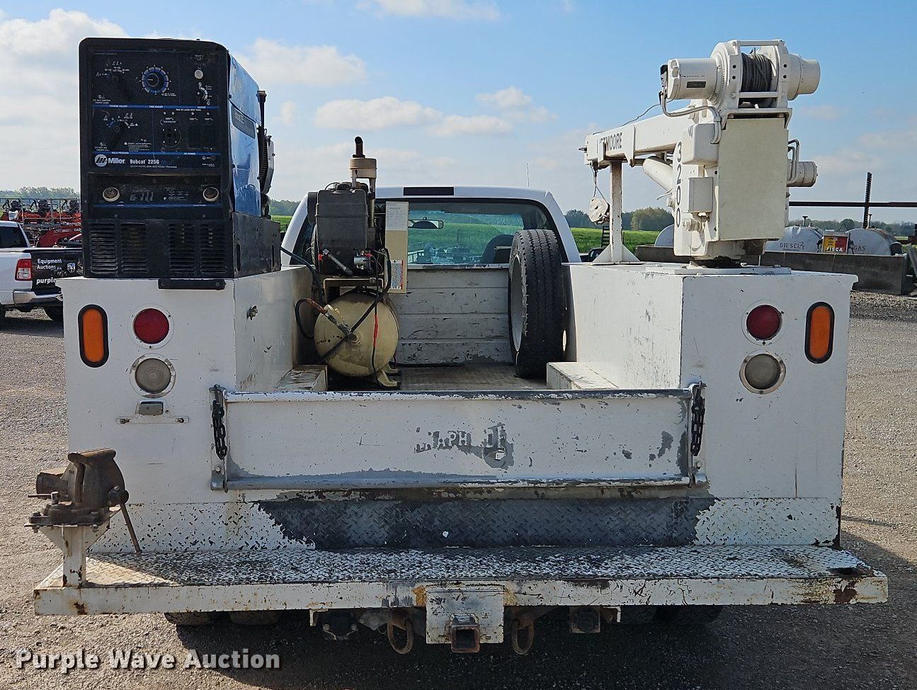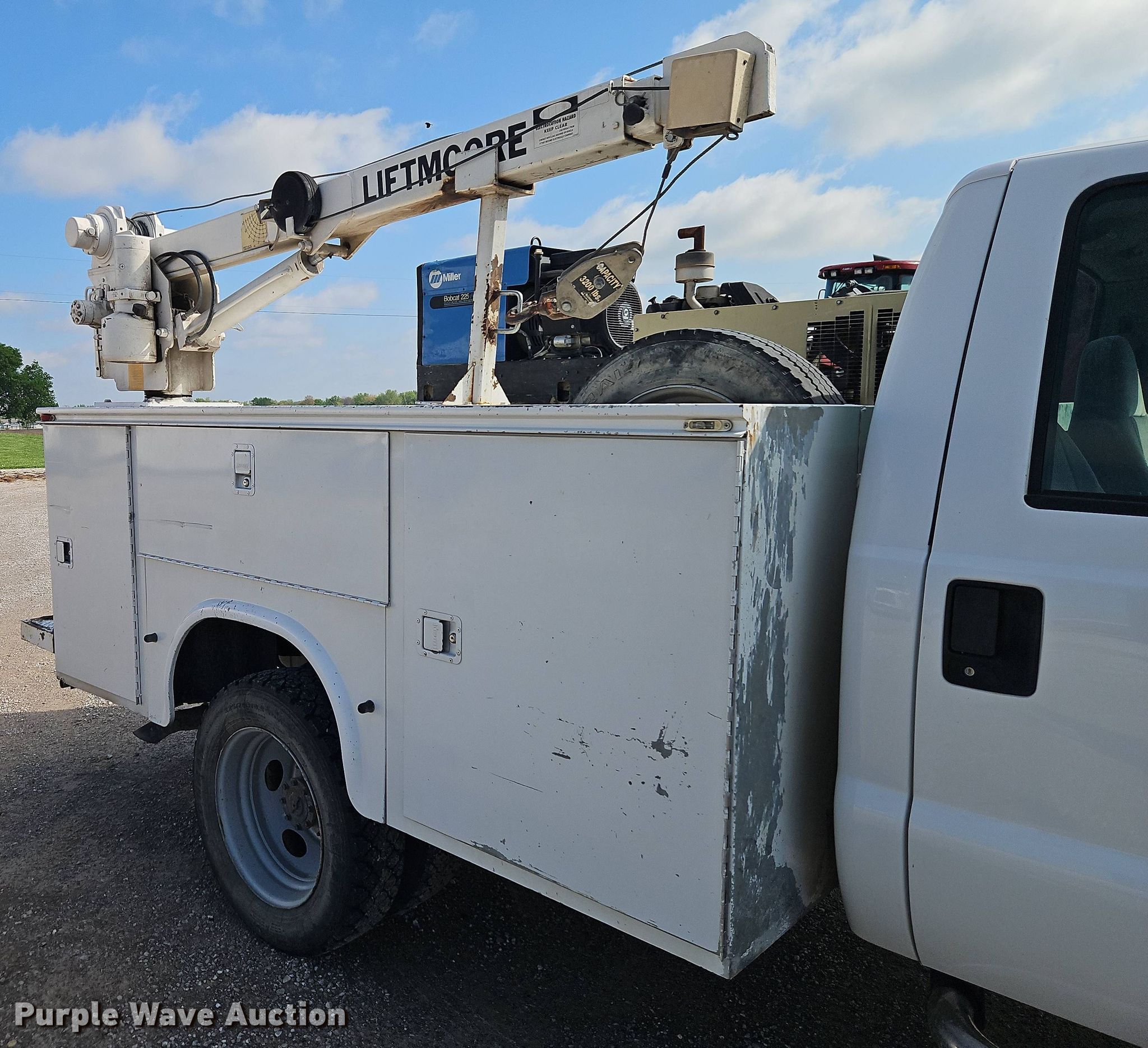 2001 Ford F450 Super Duty utility / service truck. Miles: 173,510 on odometer, VIN: 1FDXF46S41EA63583. Engine Displacement: 6.8L, Cylinders: 10, Fuel type: Gas. Transmission Automatic. Chassis Axles: Single, Suspension: Spring, Brakes: Hydraulic, GVWR: 15,000 lbs, Wheelbase: 141". Interior AC, Heat, Power windows, Power locks, Cruise control, Brake controller. Features Bed Knapheide 6132D54FJ40, 10' L x 96" W, Torch bottle rack, Welder/generator Miller Bobcat 225G, Hours: 80 on meter, Fuel type: Gas, 240V outlets: 1, 120V outlets: 4, Watts: 8,000, Welder type: Tig, CC, CV, Wire, Stick (AC/DC), Air compressor Ingersoll Rand 2475, Kohler Command Pro 12.5, Crane Lift More 3200, Maximum boom length: 15' Maximum lift capacity: 3,200 lbs.. Tires Size: 225/70R19.5F. Missouri title. Title distribution may be delayed up to 14 days from verification of funds. Heartland Tractor Company. Harrisonville, MO 64701
