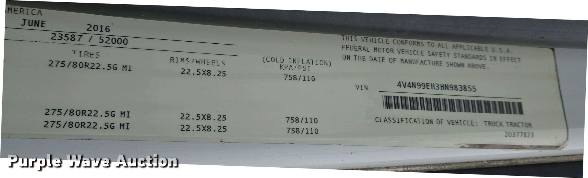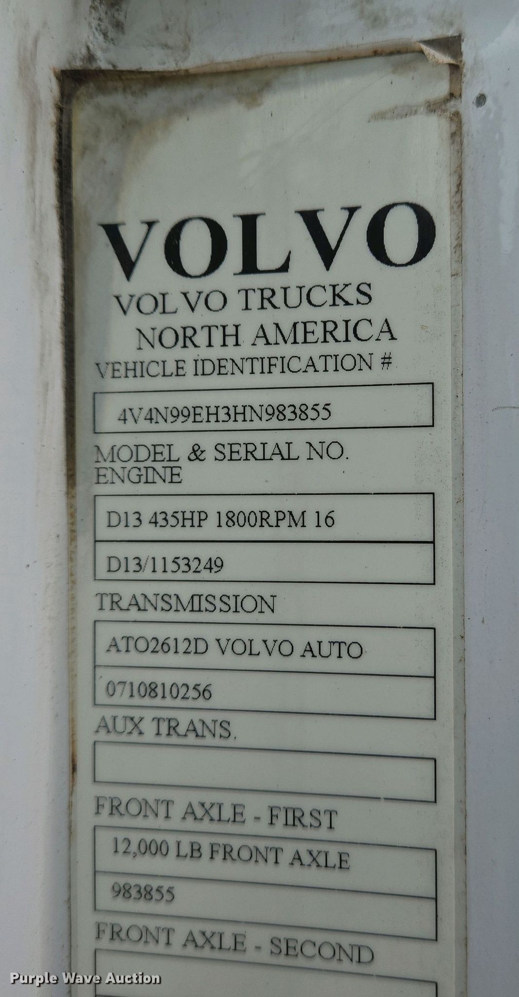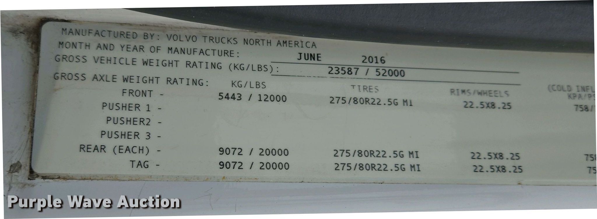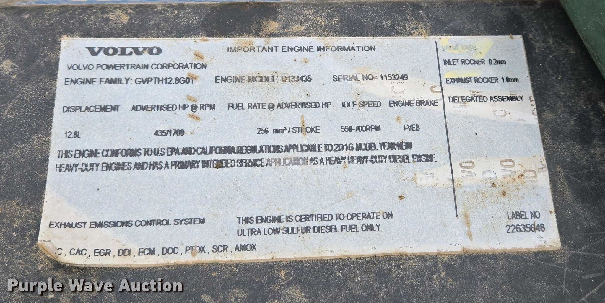 2017 Volvo VNL semi truck. Miles: 482,134 on odometer, Hours: 13,836 on meter, VIN: 4V4N99EH3HN983855, Unit #: B87. Engine Volvo D13, Serial: 1153249, Displacement: 12.8L, Cylinders: 6, Fuel type: Diesel, Engine brake. Transmission Volvo I-Shift, Automated manual. Chassis Axles: Tandem, Differential lock: Full, Suspension: Air Dump valves, Brakes: Air, GVWR: 5,200 lbs FAWR: 12,000 lbs, IAWR: 20,000 lbs, RAWR: 20,000 lbs. Interior AC, Heat, Heated mirrors, Power windows, Power locks, Cruise control. Features Deck plate: Aluminum, Fifth wheel type: Fixed, Fuel tank: Dual. Tires Size: 295/75R22.5, 275/80R22.5. Notes Non-operational rear axle, Maintenance records available upon request at [email protected]. Kentucky title. Title distribution may be delayed up to 14 days from verification of funds. Tosh Farms. Henry, TN 38231