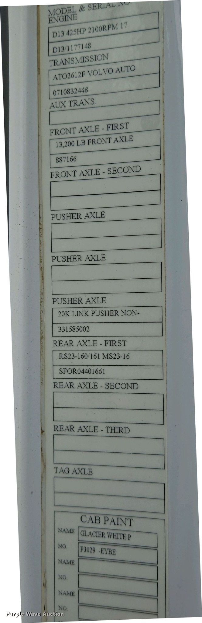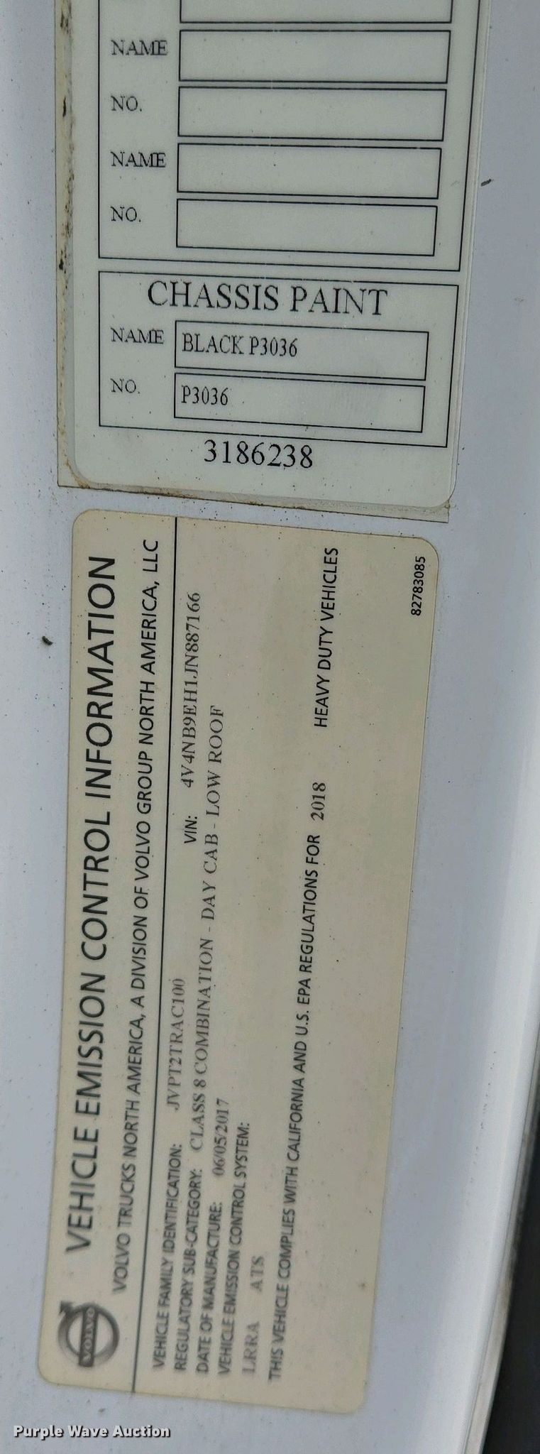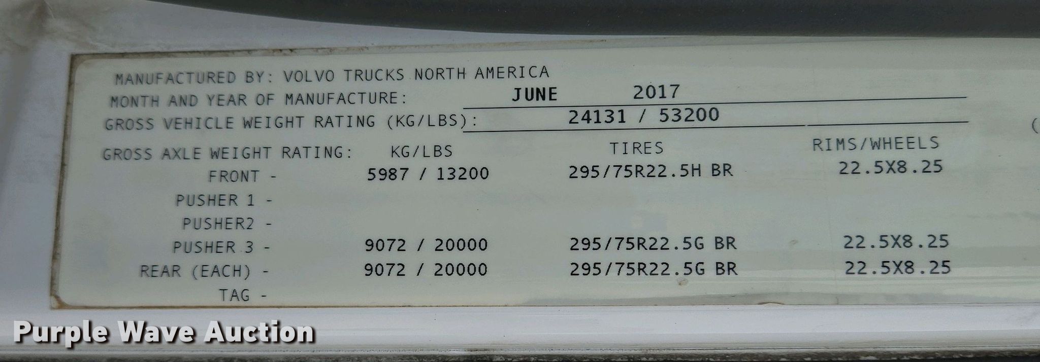 2018 Volvo VNL semi truck. Miles: 535,216 on odometer, Hours: 16,435 on meter, VIN: 4V4NB9EH1JN887166, Unit #: B98. Engine Volvo D13, Serial: 1177148, Displacement: 12.8L, Cylinders: 6, Fuel type: Diesel, Engine brake. Transmission Volvo I-Shift, Automated manual. Chassis Axles: Tandem, Pusher axle, Differential lock: Full, Suspension: Air Dump valves, Brakes: Air, GVWR: 53,200 lbs FAWR: 13,200 lbs, IAWR: 20,000 lbs, RAWR: 20,000 lbs. Interior AC, Heat, Heated mirrors, Power windows, Power locks, Cruise control. Features Deck plate: Aluminum, Fifth wheel type: Fixed, Fuel tank: Dual. Tires Size: 295/75R22.5, 275/80R22.5. Notes Maintenance records available upon request at [email protected]. Tennessee title. Title distribution may be delayed up to 14 days from verification of funds. Tosh Farms. Henry, TN 38231
