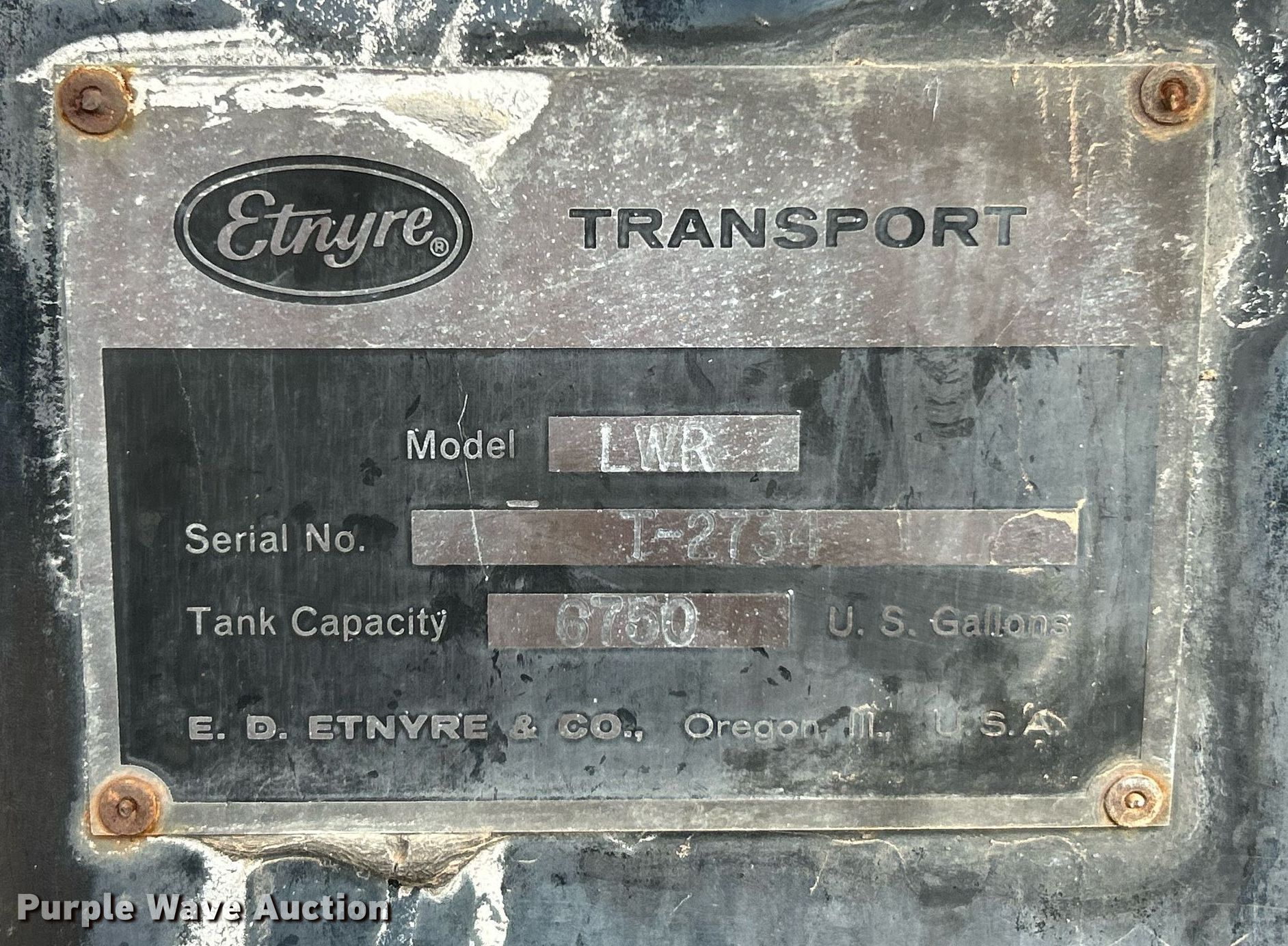 1992 Etnyre LWR tank trailer. VIN: 1E9T44209NE007092, Unit #: 208. Dimensions Overall: 43' L x 93" W. Features Tank type: Steel Capacity: 6,750 gallons, Outlet valves: 1 Size: 4", No. of manways/manholes: 1 Width: 20". Chassis Landing gear: Dual, Suspension: Spring, Brakes: Air, Axles: Tandem. Tires Steel wheels, Size: 11R22.5. Notes Hoses not included. Missouri title. Title distribution may be delayed up to 14 days from verification of funds. Peterson Oil Company. Sullivan, MO 63080