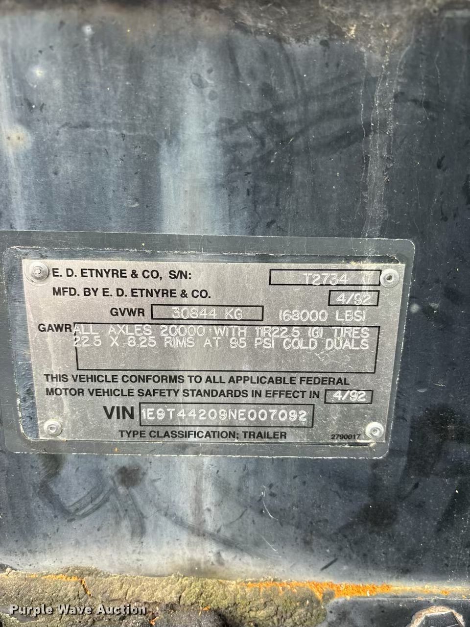 Purple Wave is selling a used Tank Trailer in Missouri. This item is a 1992 Etnyre LWR tank trailer with the following: VIN: 1E9T44209NE007092, Unit #: 208