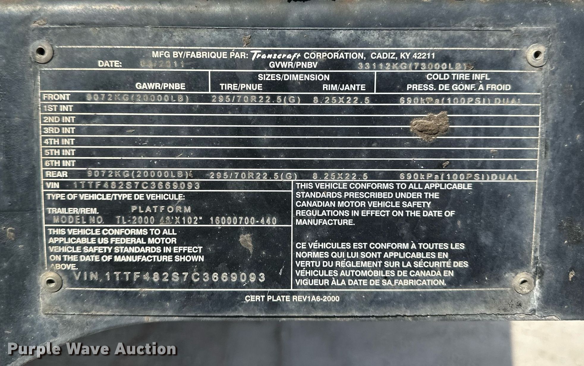 2012 Transcraft TL200 flatbed trailer. VIN: 1TTF482S7C3669093. Dimensions Overall: 48' L x 102" W, Deck: 48' L x 102" W, Deck height: 4' 9". Features Deck type: Wood. Chassis Landing gear: Dual, Suspension: Air, Brakes: Air, Axles: Tandem, GVWR: 73,000 lbs.. Tires Steel wheels, Size: 295/75R22.5. Minnesota title. Title distribution may be delayed up to 14 days from verification of funds. Rock Hard Landscape Supply. Farmington, MN 55024