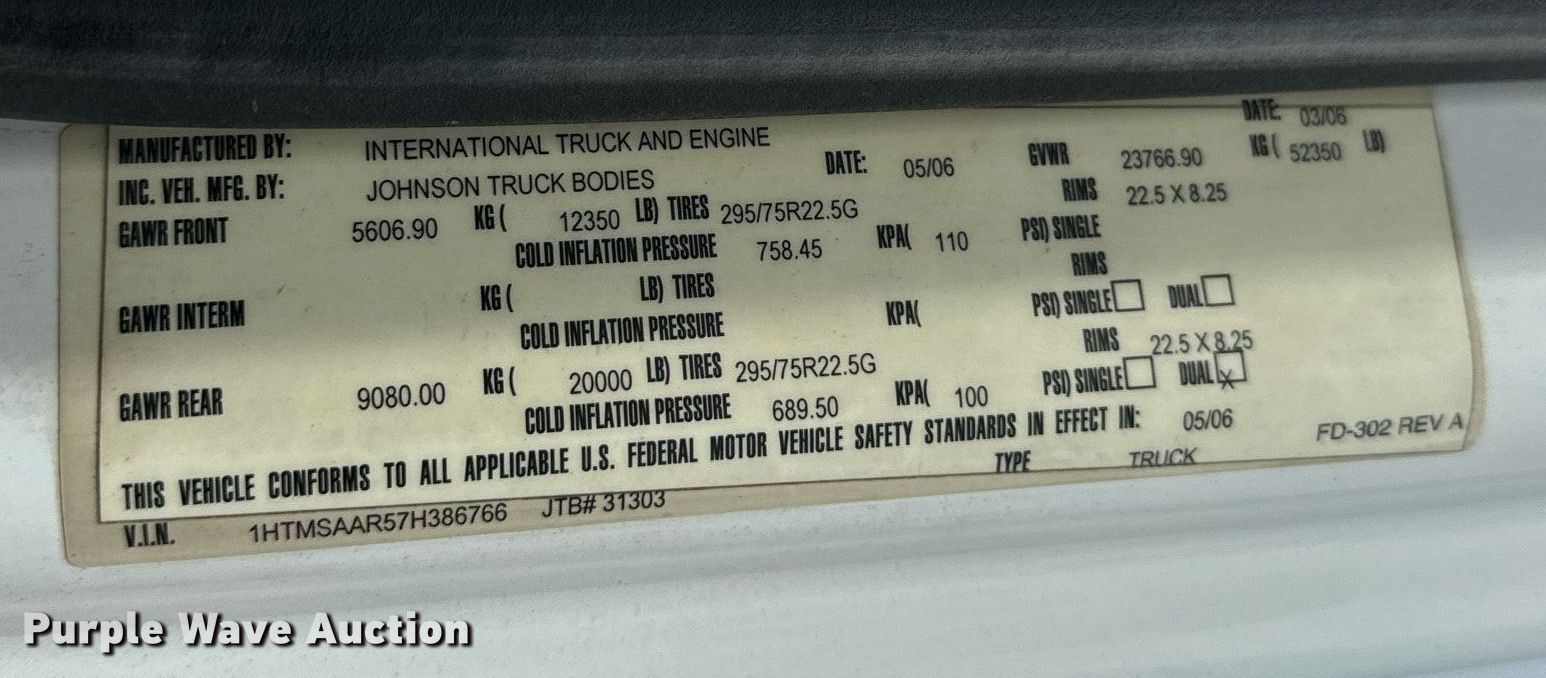 2007 International 4400 truck cab and chassis. Miles: 363,688 on odometer, Hours: 13,241 on meter, VIN: 1HTMSAAR57H386766, Unit #: 2543. Engine International DT466, Cylinders: 6, Fuel type: Diesel. Transmission Eaton Fuller, Manual, Speed: 10. Chassis Axles: Tandem, Suspension: Spring, Brakes: Air, Truck chassis: 23' 5". Interior AC, Heat, Heated mirrors, Cruise control, Air ride cab. Features Fuel tank: Single. Tires Front: 295/75R22.5, Rear: 275/80R22.5. Notes Windshield chipped or cracked, Dead battery, Air Leak, Engine issues Engine overheats under load, Non-operational AC. Nebraska title. Title distribution may be delayed up to 30 days from verification of funds. Hiland Dairy. New Bloomfield, MO 65063