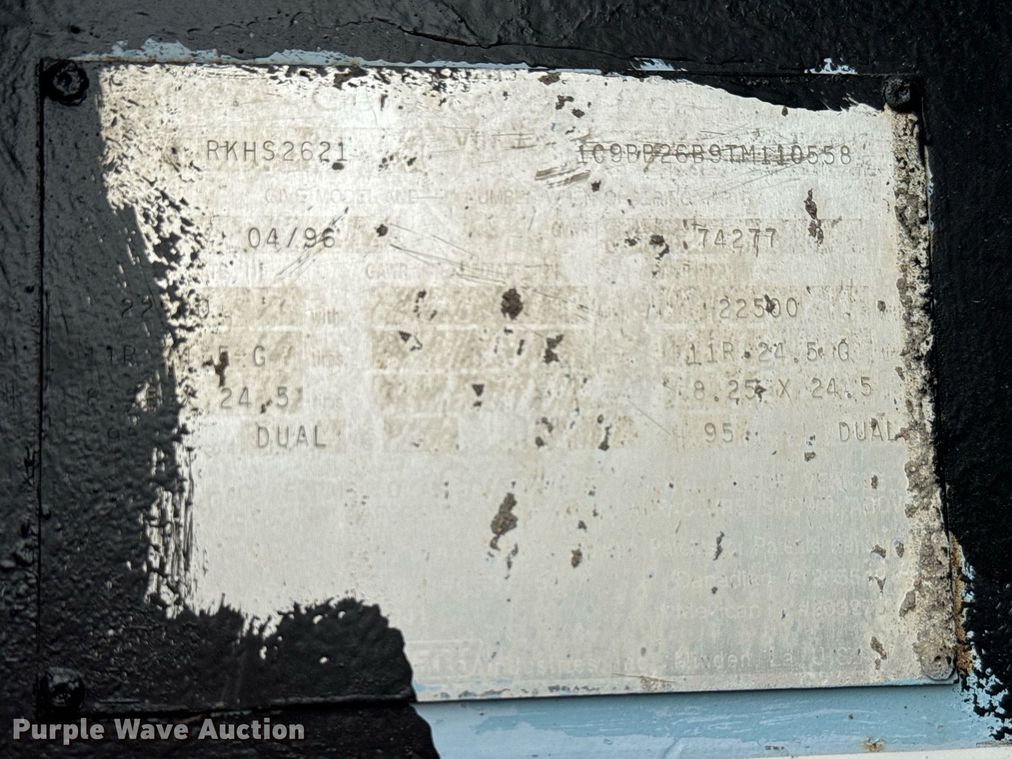 1996 Clement RKHS2621 end dump trailer. VIN: 1G9BB26B9TM110558. Dimensions Overall: 29' L x 102" W, Body: 26' L x 96" W, Side height: 50". Features Body type: Steel, Ram: Single, End gate: Air operated, Roll tarp. Chassis Landing gear: Dual, Suspension: Spring, Brakes: Air, Axles: Tandem, GVWR: 74,277 lbs, GAWR: 22,500 lbs. Tires Steel wheels, Size: 11R24.5. Notes Roll tarp torn. Kansas title. Title distribution may be delayed up to 14 days from verification of funds. Tow Service Inc. Wichita, KS 67216