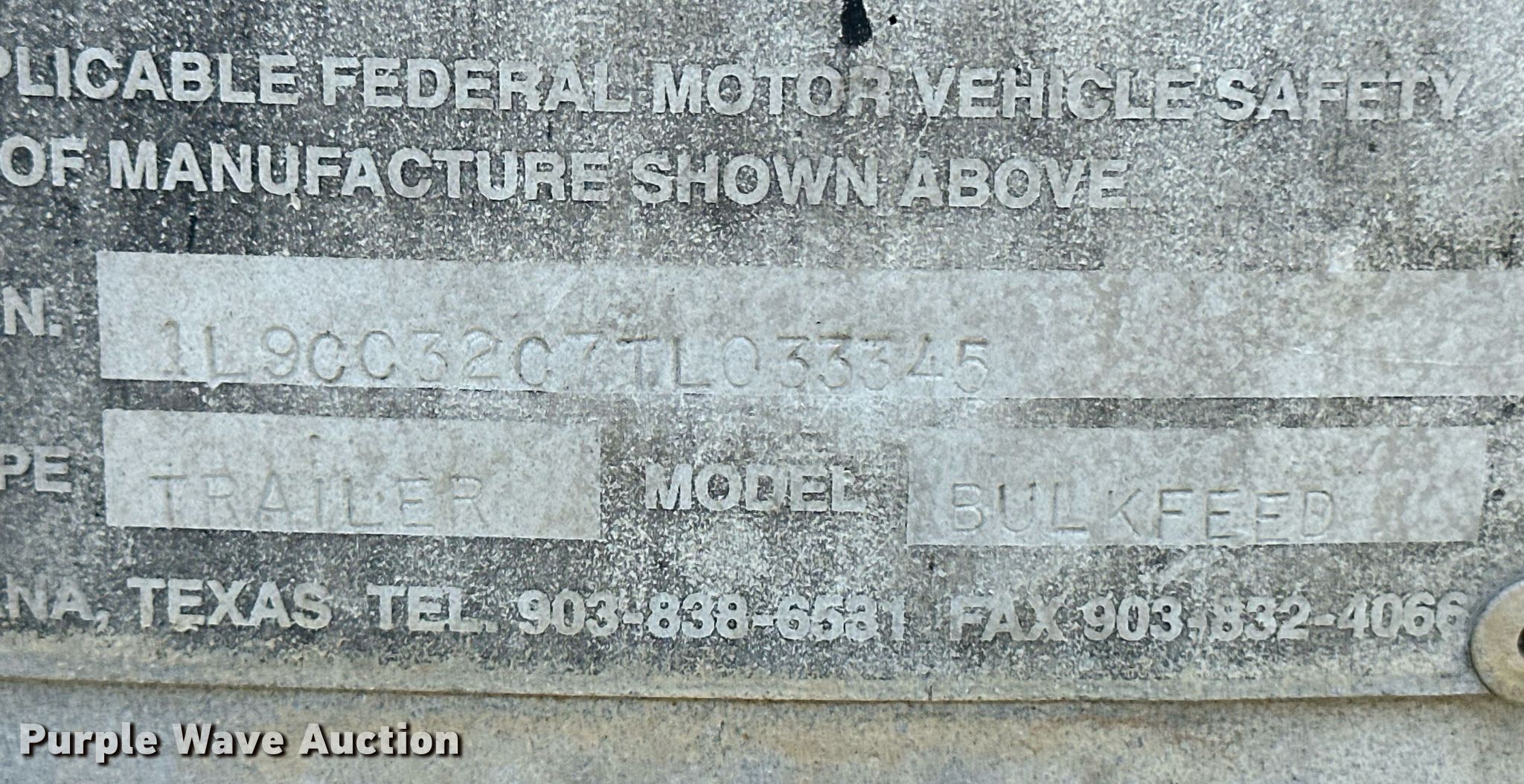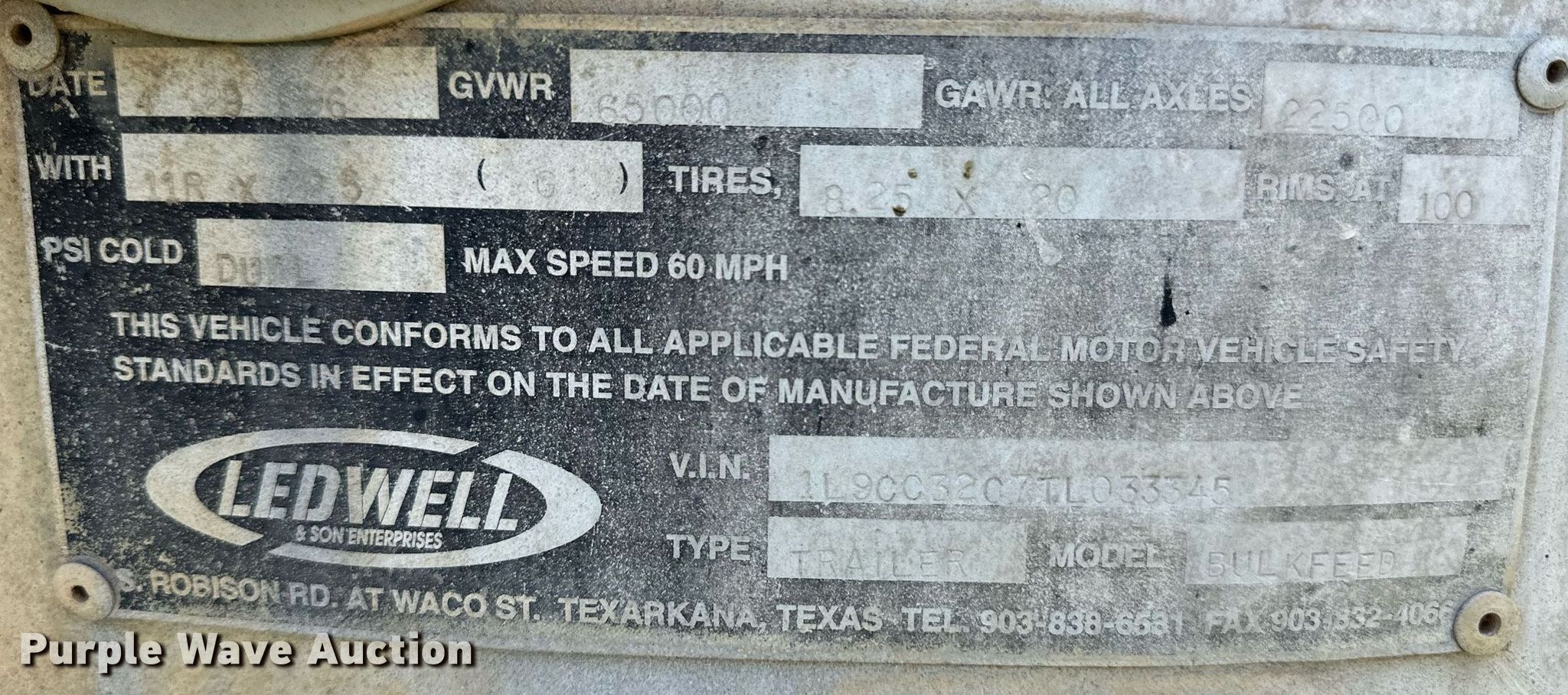 1996 Ledwell Bulkfeed feed delivery trailer. VIN: 1L9CC32C7TL033345. Dimensions Overall: 42' L x 96" W. Features Body type: Aluminum, Discharge auger Length: 30', Diameter: 9". Chassis Landing gear: Dual, Suspension: Air, Brakes: Air, Axles: Tandem, GVWR: 65,000 lbs, GAWR: 22,500 lbs. Tires Steel wheels, Size: 295/75R22.5. Virginia title. Title distribution may be delayed up to 14 days from verification of funds. Laverne, OK 73848