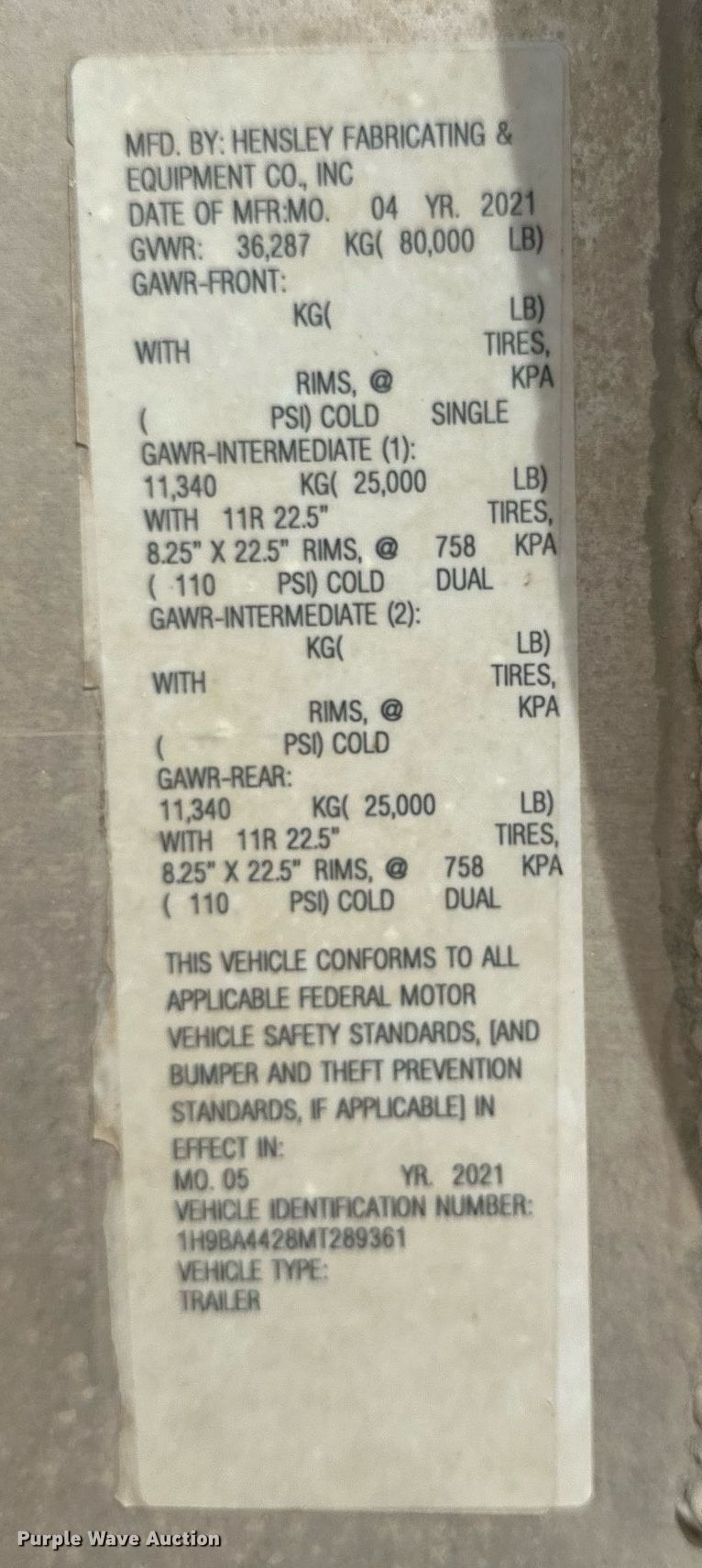 Purple Wave is selling a used Fertilizer or Feed Delivery Trailer in Oklahoma. This item is a 2021 Hensley ATLW-40-35-8 feed delivery trailer with the following: VIN: 1H9BA4428MT289361