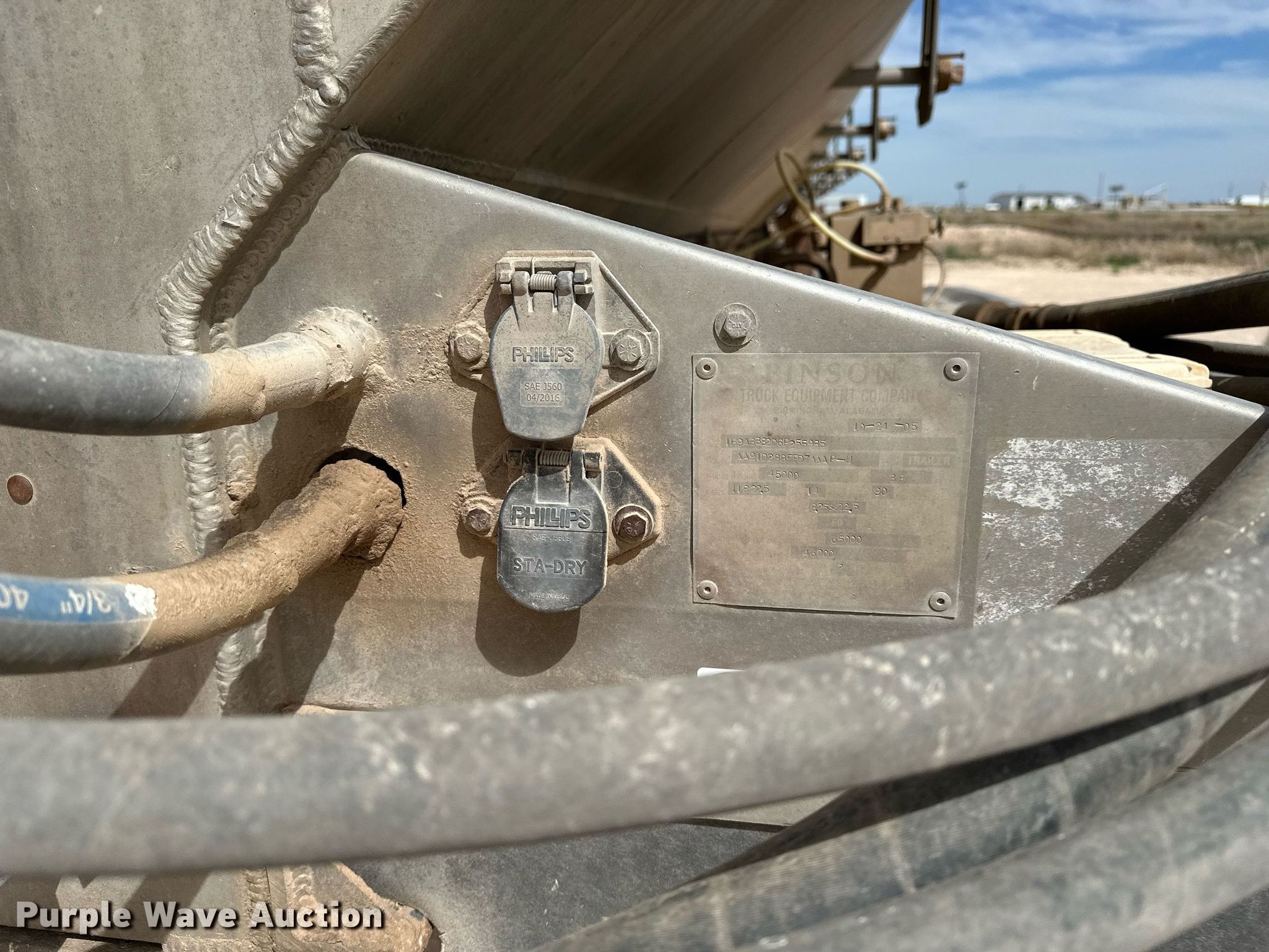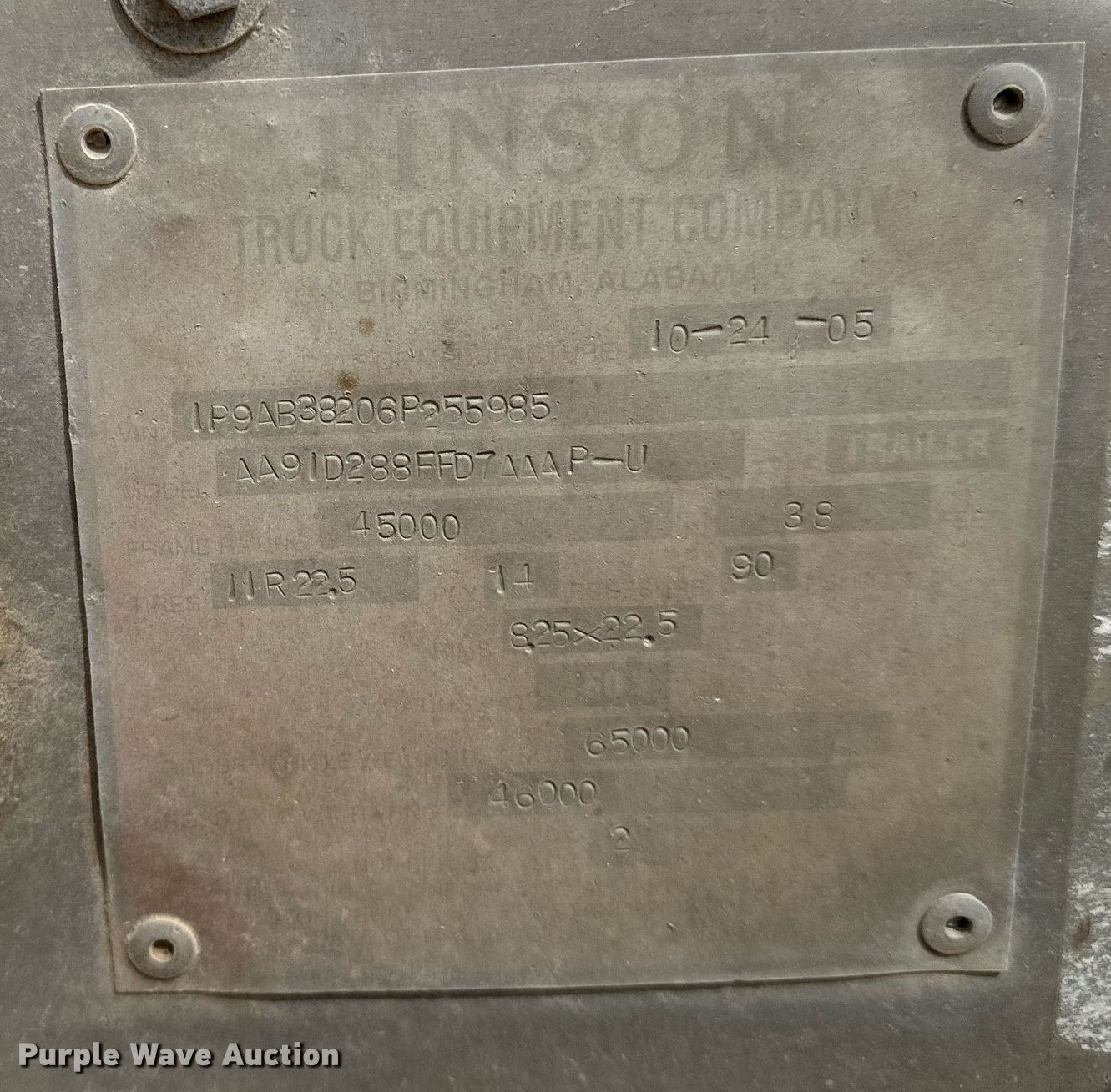 2006 Pinson AA9ID288FFD7AAAP-U feed delivery trailer. VIN: 1P9AB38206P255985, Unit #: 4238. Dimensions Overall: 42' 2" L x 94" W, Body length: 38'. Features Compartments: 9, Discharge auger Length: 28', Diameter: 10", Reclaim auger Length: 22', Diameter: 10". Chassis Landing gear: Dual, Suspension: Air, Brakes: Air, Axles: Tandem, GVWR: 65,000 lbs. Tires Steel wheels, Size: 11R22.5. Titles will be distributed after confirmation of payment and removal. Kansas title. Title distribution may be delayed up to 30 days from verification of funds. Seaboard Foods. Optima, OK 73945