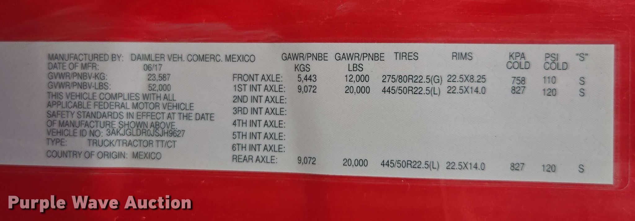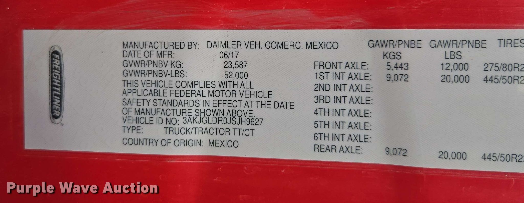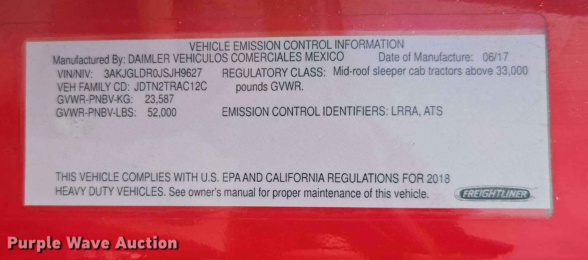 Purple Wave is selling a used Truck Tractor in Tennessee. This item is a 2018 Freightliner Cascadia 125 semi truck with the following: Miles: 696,541 on odometer, VIN: 3AKJGLDR0JSJH9627