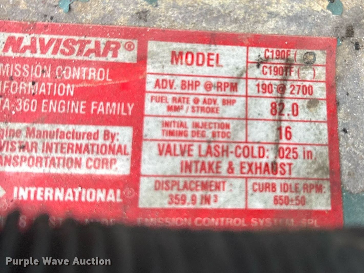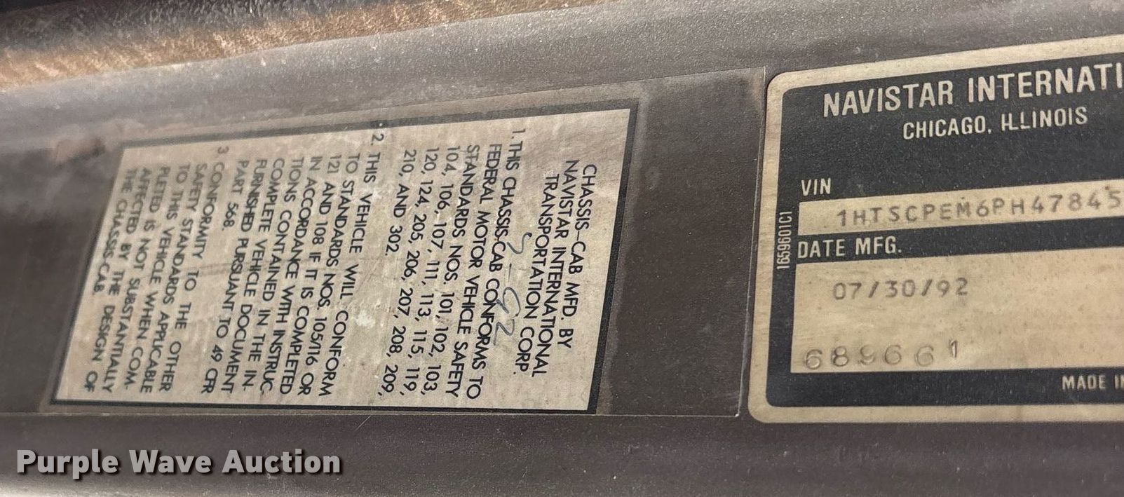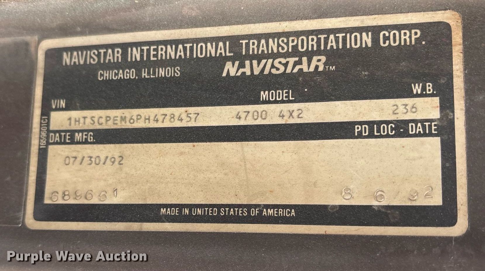 1993 International 4700 flatbed truck. Miles: 411,633 on odometer, VIN: 1HTSCPEM6PH478457. Engine Navistar C190F, Displacement: 360 C.I.D., Cylinders: 6, Fuel type: Diesel. Transmission International 6 Plus, Manual, Speed: 7. Chassis Axles: Single, Suspension: Spring, Brakes: Hydraulic, Wheelbase: 236". Interior AC, Heat. Features Flatbed 26' L x 8' 4" W. Tires Size: 295/75R22.5. Notes AC belt missing. Oklahoma title. Seller is an Oklahoma licensed motor vehicle dealer. Title will be assigned and distributed by the dealer. Please contact the seller for distribution questions. Title distribution may be delayed up to 14 days from verification of funds. Tulsa, OK 74107