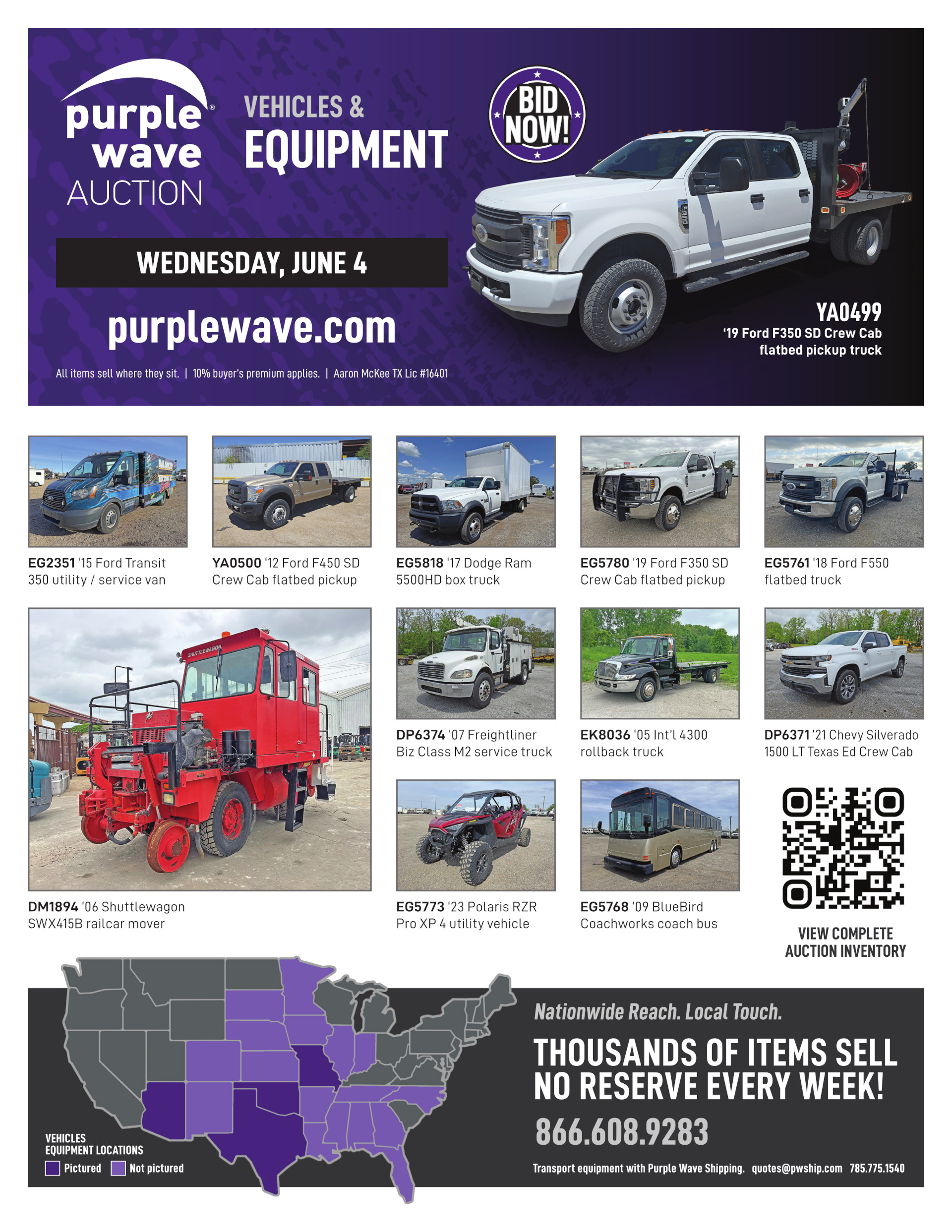 Purple Wave Shipping, LLC provides shipping and transportation services to winning bidders on ag, construction and fleet type assets. Purple Wave Shipping, LLC does not provide shipping on items weighing less than 1,000 pounds.