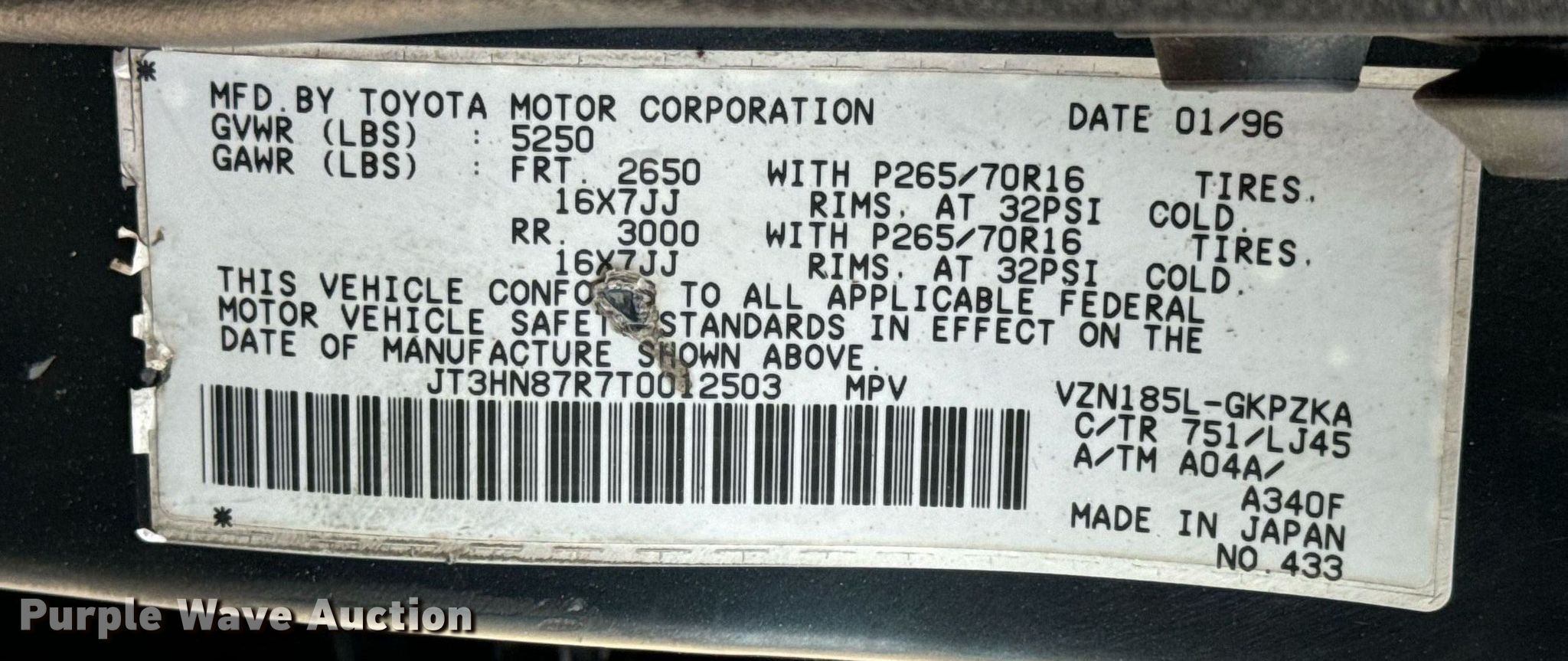 Purple Wave is selling a used Passenger Vehicle in Missouri. This item is a 1996 Toyota 4Runner Limited SUV with the following: Miles: 289,852 on odometer, VIN: JT3HN87R7T0012503
