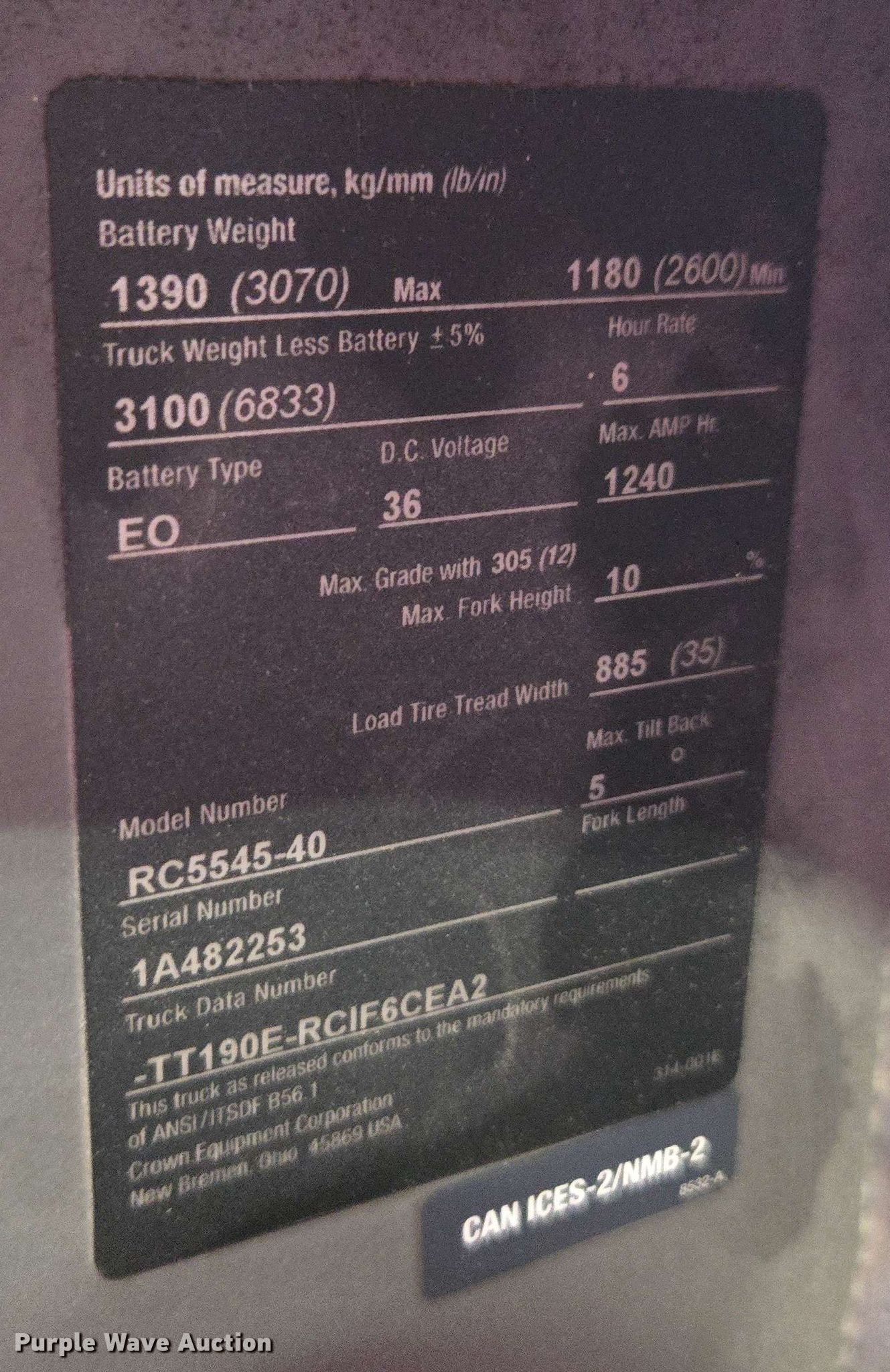 2017 Crown RC5545-40 forklift. Hours: 4,456 on meter, Serial: 1A482253, Unit #: SFS2085. Electric Motor Volts: 36. Transmission Electric drive. Operators station OROPS. Features Maximum lift capacity: 4,000 lbs, Collapsed mast height: 83", Mast stages: 2, Mast tilt, Fork length: 48". Tires Size: 16x7x10.5, Solid. Notes Battery weak. Ferguson. Fulton, MS 38843