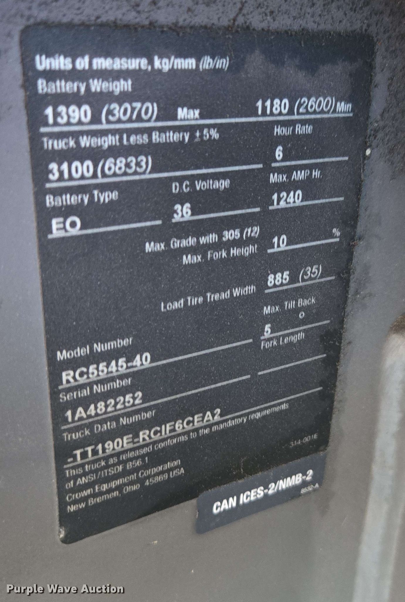 Crown RC5545-40 forklift. Hours: Unknown, Serial: 1A482252. Electric Motor Volts: 36. Transmission Electric drive. Operators station OROPS. Features Maximum lift capacity: 4,000 lbs, Collapsed mast height: 83", Mast stages: 2, Mast tilt, Fork length: 48". Tires Size: 16x7x10.5, Solid. Notes Charger not included, Dead battery, Unknown operating condition. Ferguson. Fulton, MS 38843