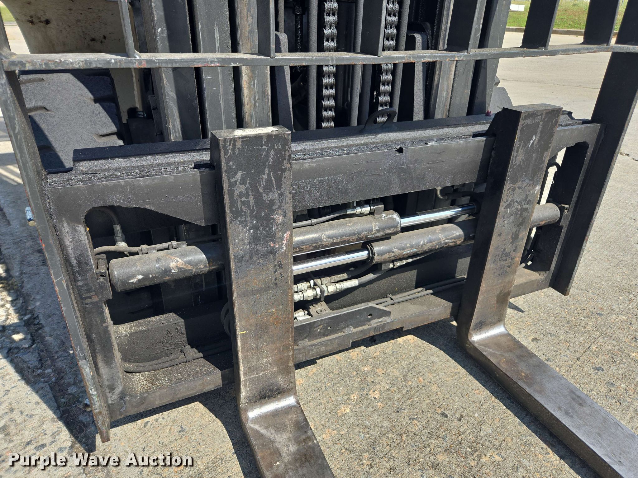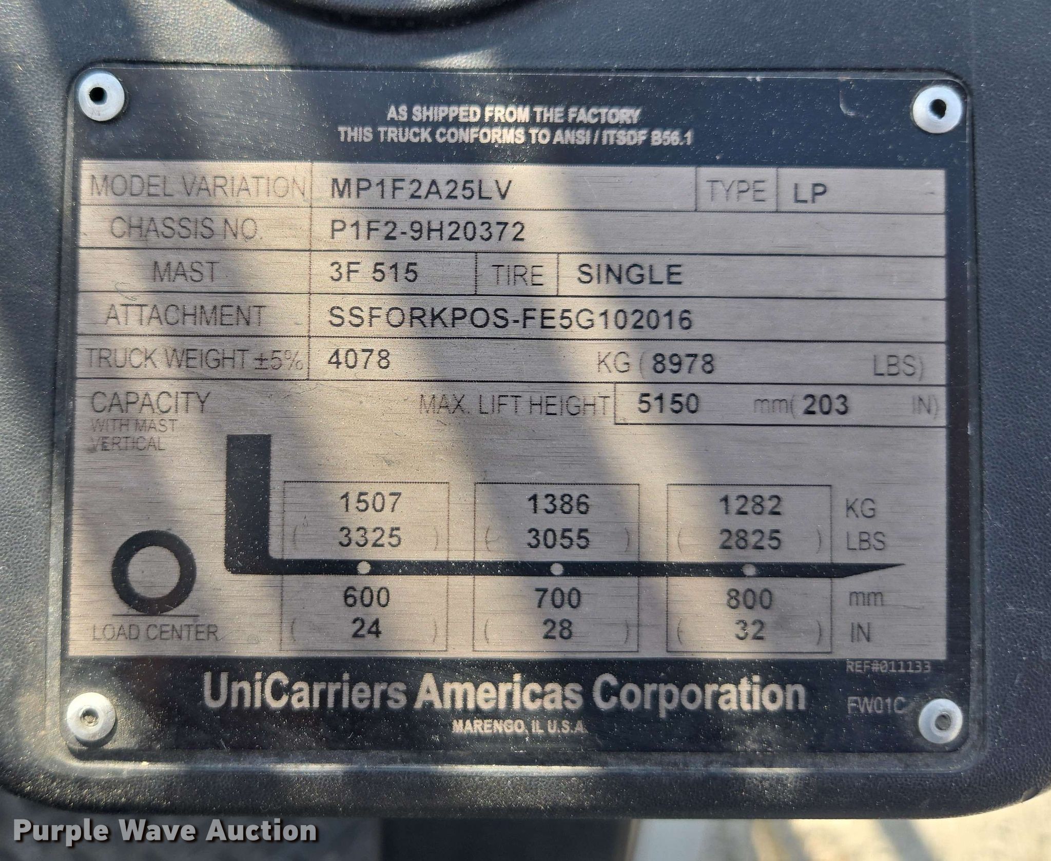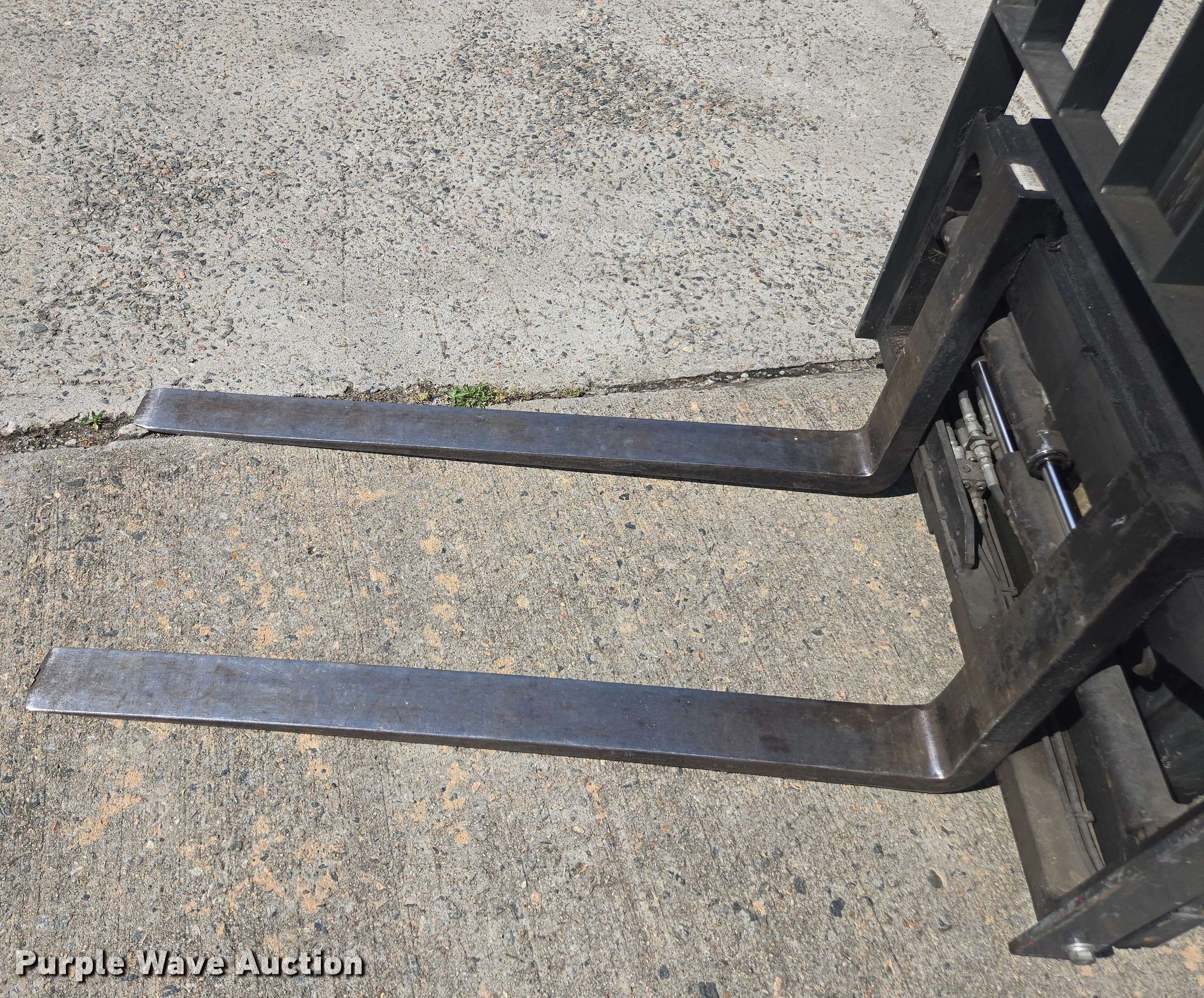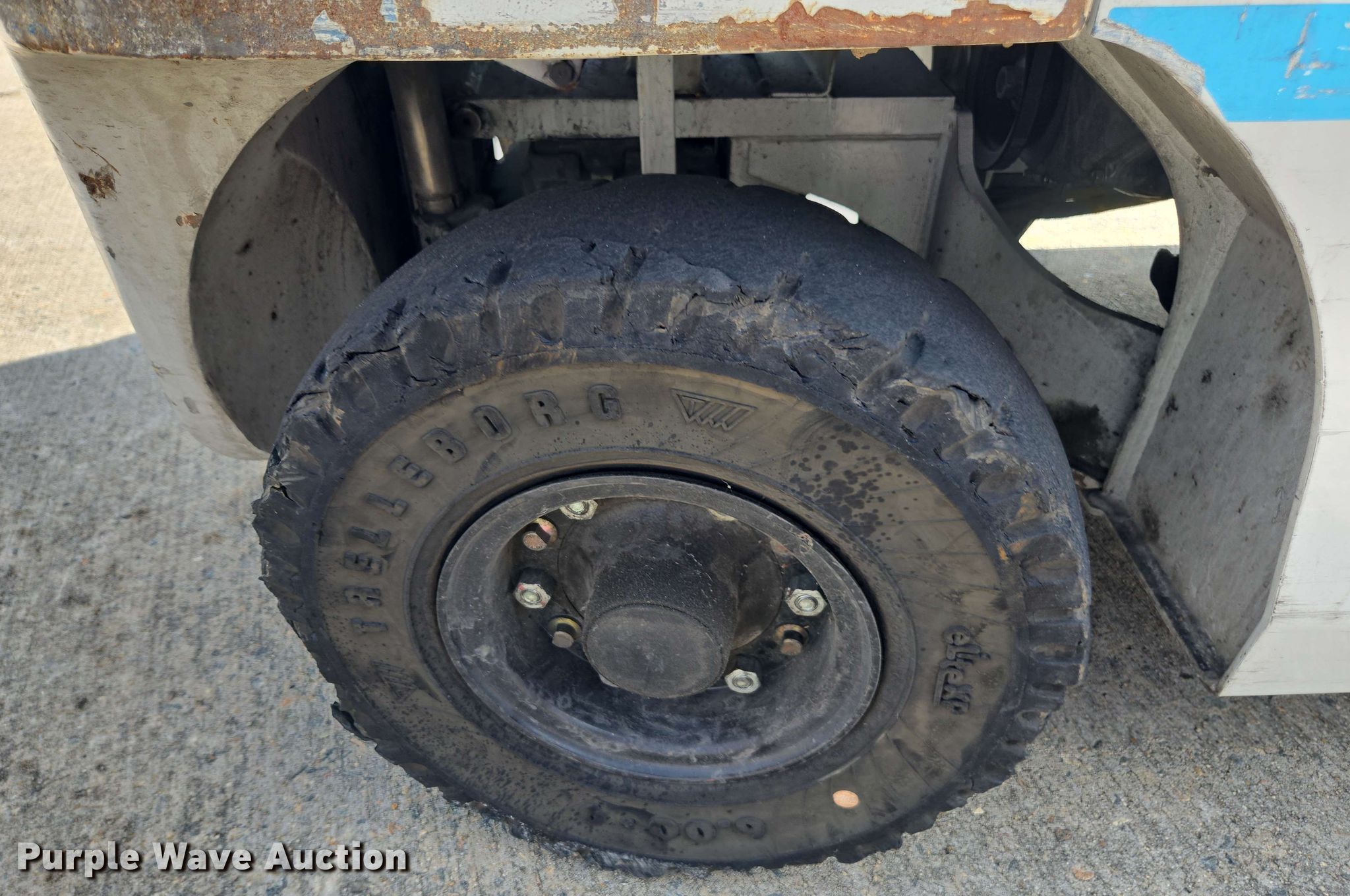 Nissan PF50 forklift. Hours: 1,670 on meter, Serial: P1F2-9H20372, Unit #: SFS2054. Engine Displacement: 2.1L, Cylinders: 4, Fuel type: LPG LP bottle: Not included. Transmission Automatic. Operators station OROPS. Features Maximum lift capacity: 3,325 lbs, Maximum lift height: 203", Collapsed mast height: 89", Mast stages: 3, Side shift, Mast tilt, Fork length: 48". Tires Front: 7.00-12, Rear: 6.00-9, Solid. Ferguson. Macon, GA 31206
