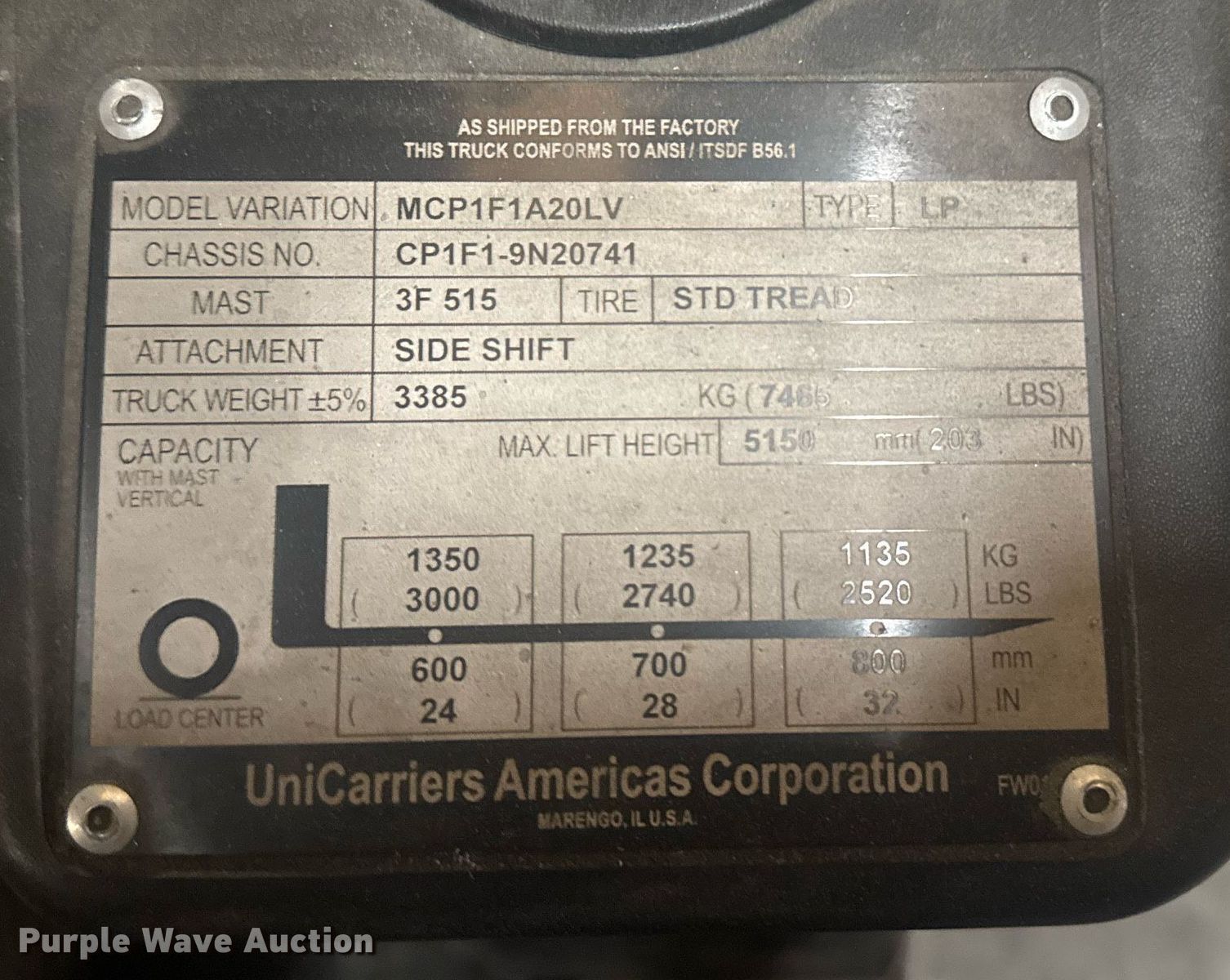 2016 UniCarriers CFS40 forklift. Hours: 540 on meter, Serial: CP1F1-9N20741, Unit #: SFS2045. Engine Displacement: 2.1L, Cylinders: 4, Fuel type: LPG LP bottle: Not included. Transmission Automatic. Operators station OROPS. Features Maximum lift capacity: 3,000 lbs, Maximum lift height: 203", Collapsed mast height: 88", Mast stages: 3, Side shift, Mast tilt, Fork length: 18". Tires Front: 18x6x12.125, Rear: 14x5x10, Solid. Ferguson. Myrtle Beach, SC 29577