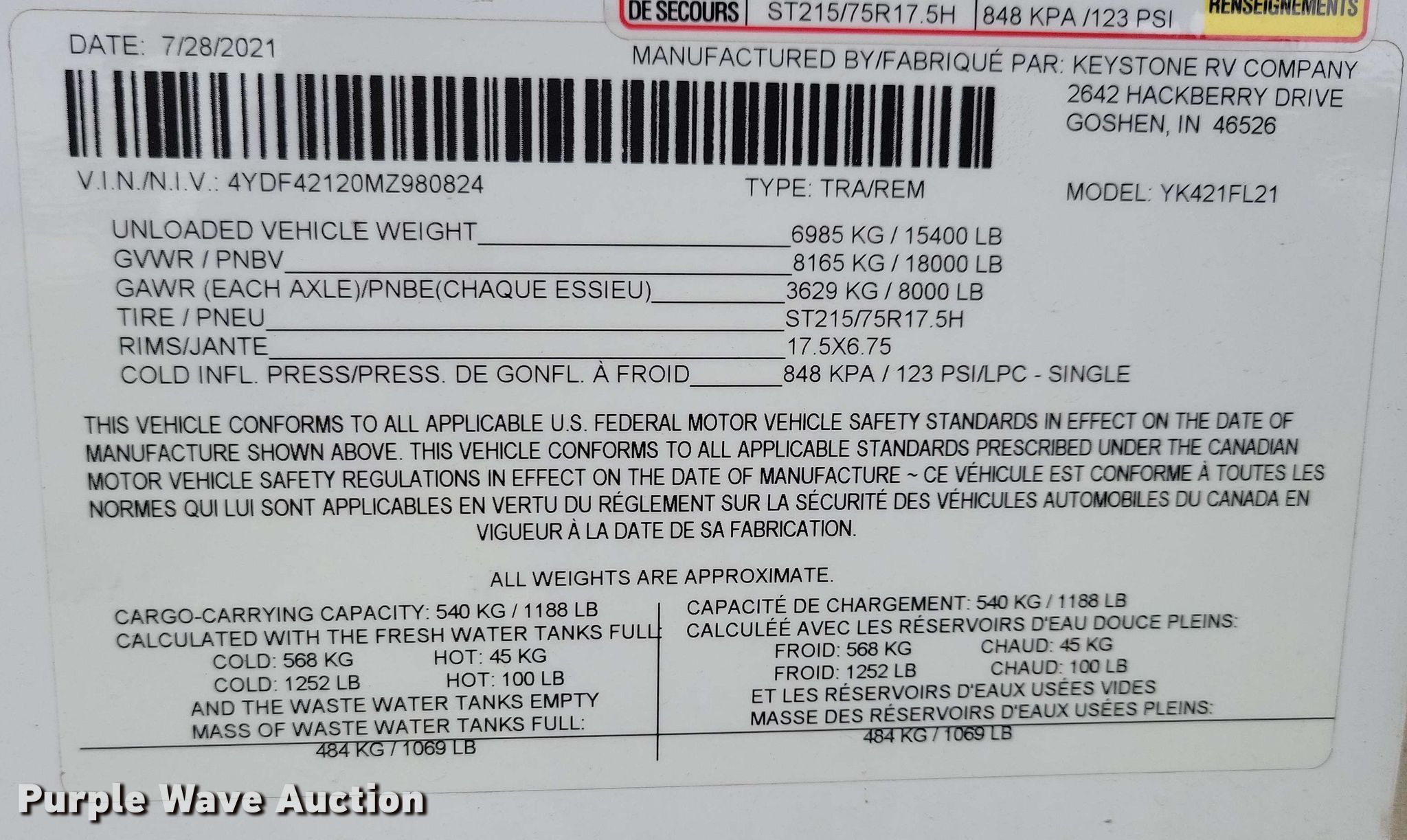 Purple Wave is selling a used RV or Camper in South Dakota. This item is a 2021 Keystone Yukon 421FL camper with the following: Camper length: 46', VIN: 4YDF42120MZ980824, Unit #: C87-24