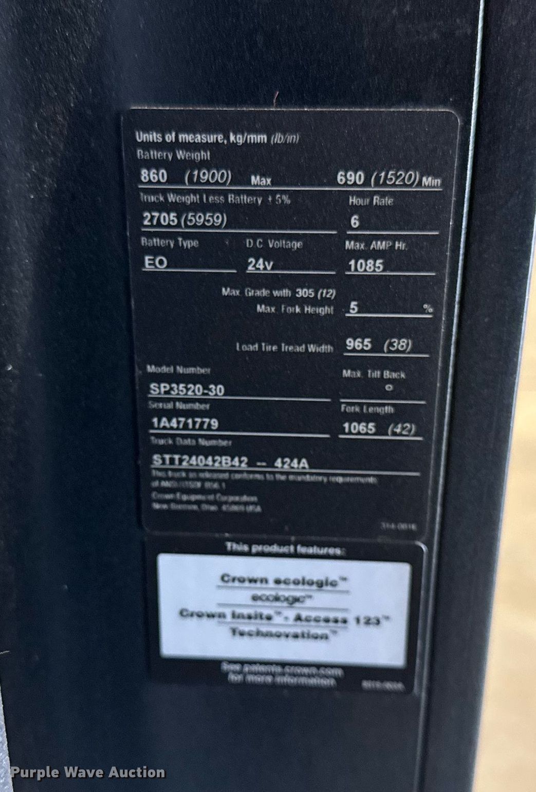 Crown SP3520-30 order picker. Hours: 79 on meter, Serial: 1A471779, Unit #: SFS2072. Electric Motor Volts: 24. Transmission Electric drive. Operators station Canopy. Features Maximum lift capacity: 3,000 lbs, Maximum lift height: 240", Collapsed mast height: 107", Mast stages: 3, Fork length: 42". Tires Solid. Notes Charger not included. Ferguson. South Bend, IN 46601