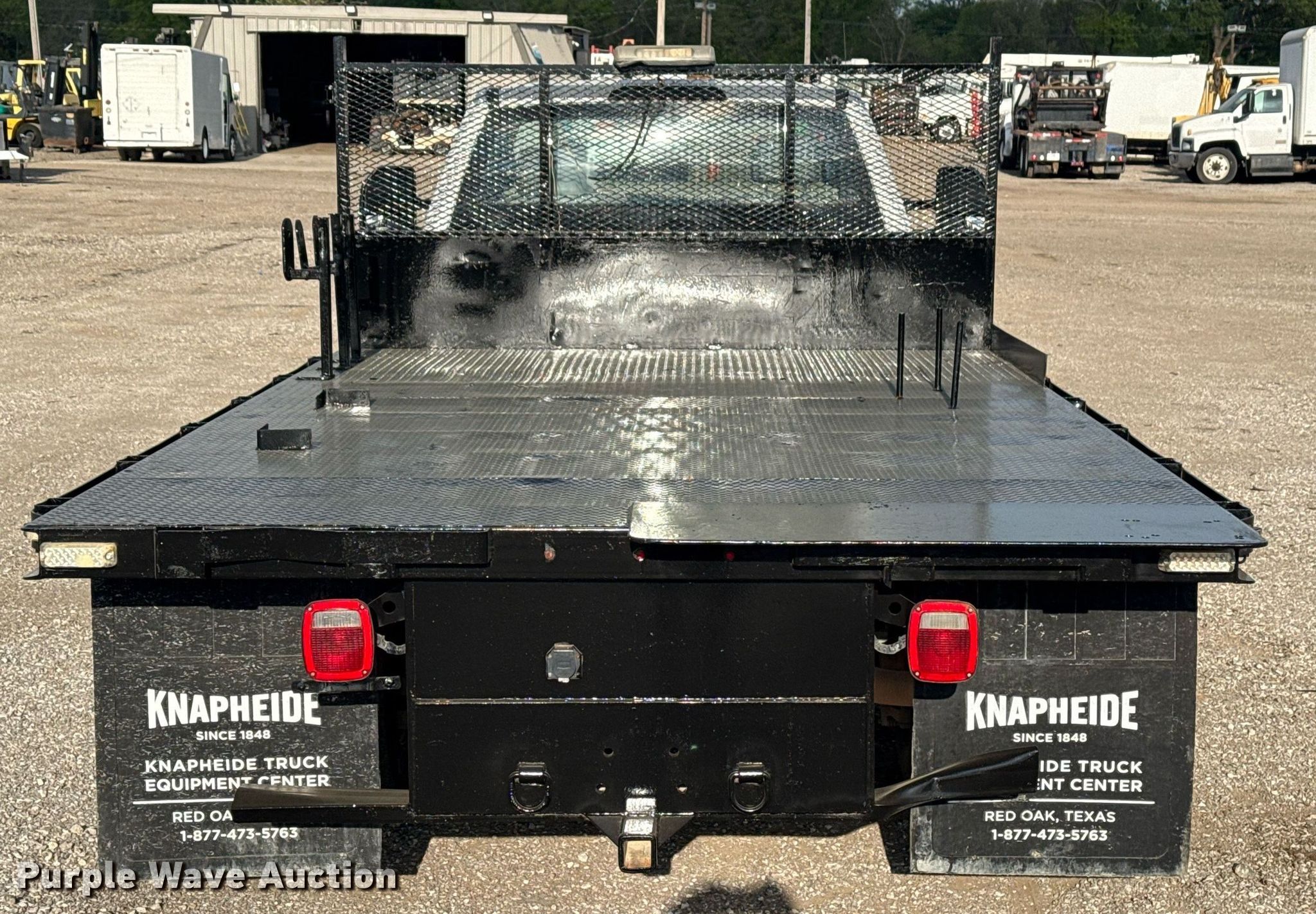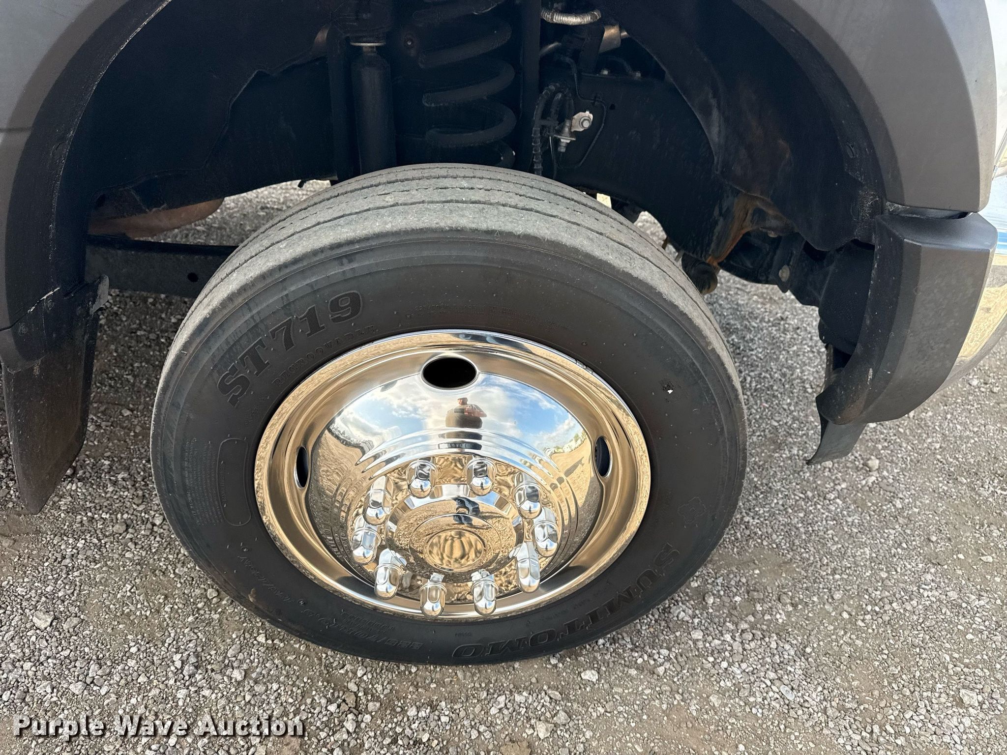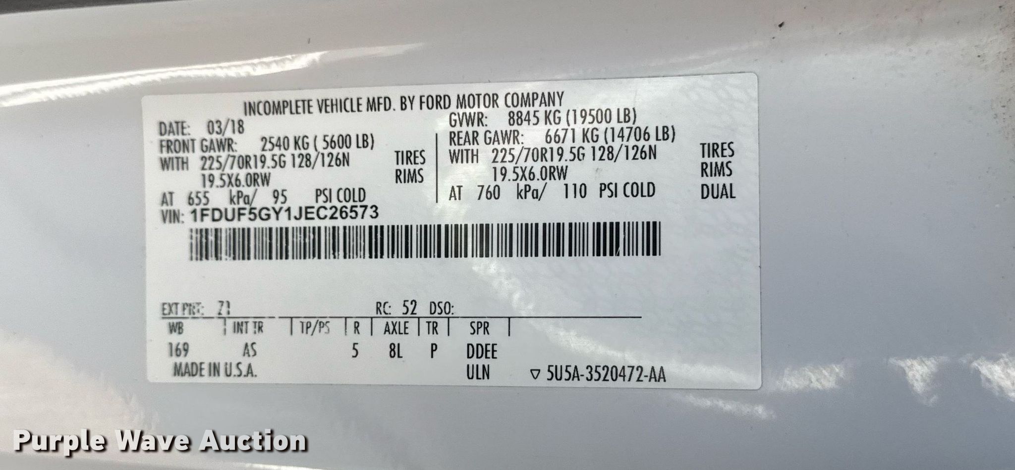 2018 Ford F550 flatbed truck. Miles: 89,245 on odometer, VIN: 1FDUF5GY1JEC26573. Engine Ford, Displacement: 6.8L, Cylinders: 10, Fuel type: Gas. Transmission Automatic. Chassis Axles: Single, Suspension: Spring, Brakes: Hydraulic, GVWR: 19,500 lbs, Wheelbase: 169". Interior AC, Heat, Heated mirrors, Power windows, Power locks, Cruise control, Auxiliary controls, Brake controller. Features Flatbed 12' 3" L x 96" W. Tires Front: 225/70R19.5, Rear: 245/70R19.5. Notes Windshield chipped or cracked. Oklahoma title. Seller is an Oklahoma licensed motor vehicle dealer. Title will be assigned and distributed by the dealer. Please contact the seller for distribution questions. Title distribution may be delayed up to 30 days from verification of funds. 15107 North 137th East Avenue. Collinsville, OK 74021