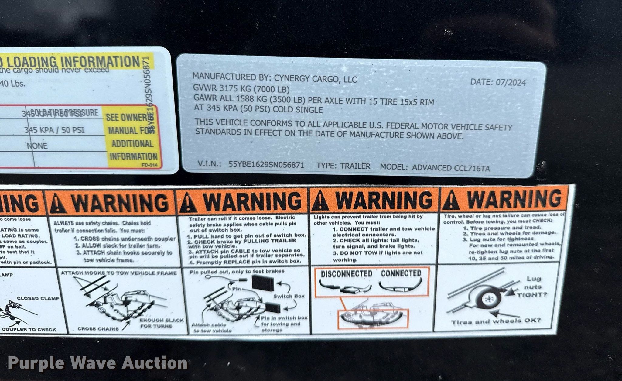 Purple Wave is selling a used Enclosed Cargo Trailer in Oklahoma. This item is a 2025 Cynergy Cargo Advanced CCL716TA enclosed cargo trailer with the following: VIN: 55YBE1629SN056871