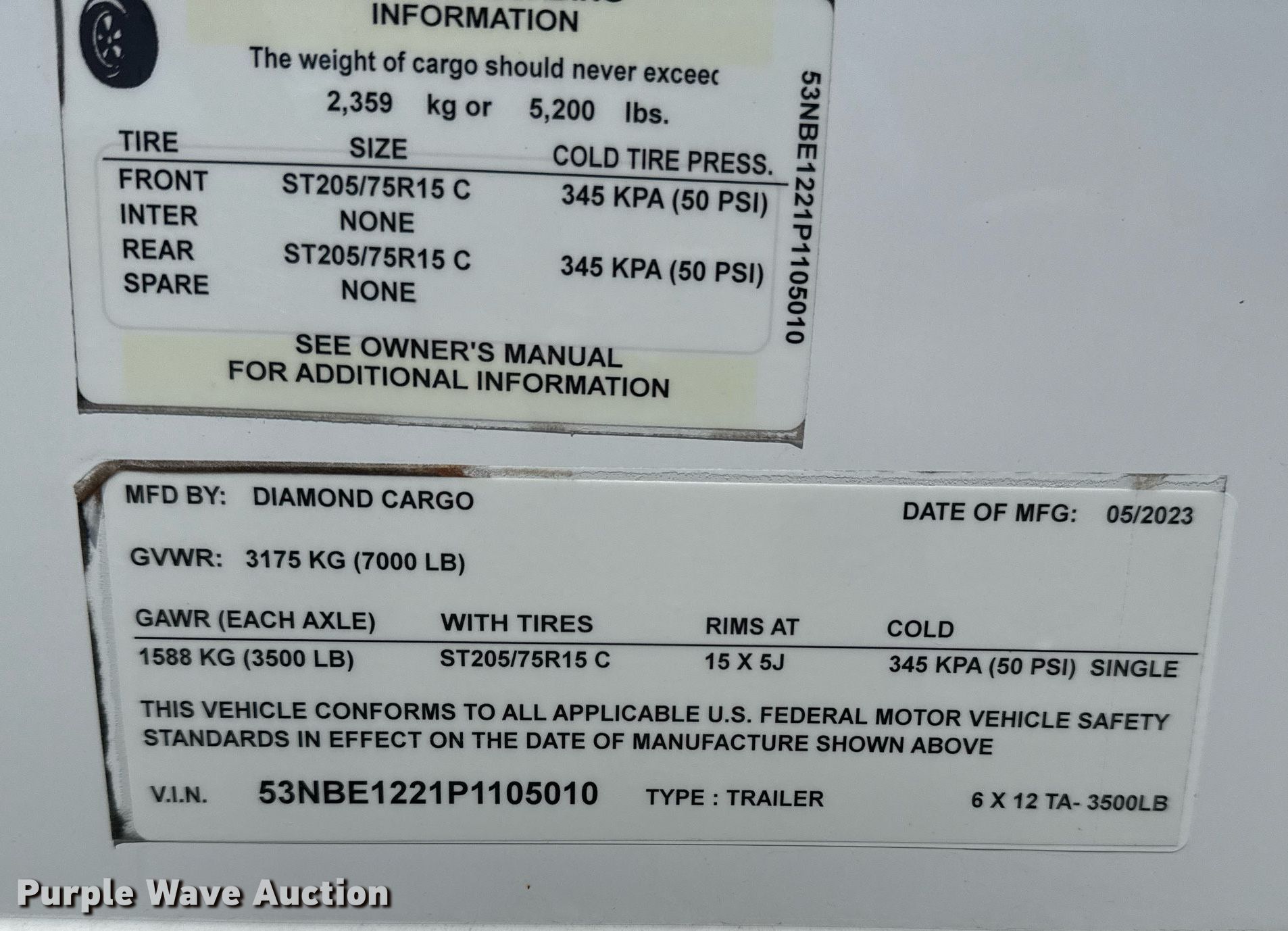 Purple Wave is selling a used Enclosed Cargo Trailer in Oklahoma. This item is a 2023 Diamond Cargo enclosed cargo trailer with the following: VIN: 53NBE1221P1105010