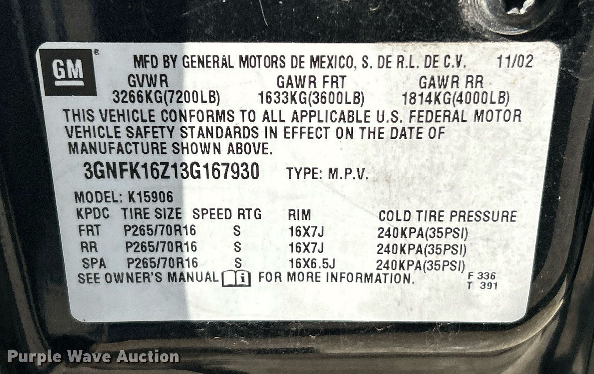 Purple Wave is selling a used Passenger Vehicle in Missouri. This item is a 2003 Chevrolet Suburban SUV with the following: Miles: 244,495 on odometer, VIN: 3GNFK16Z13G167930