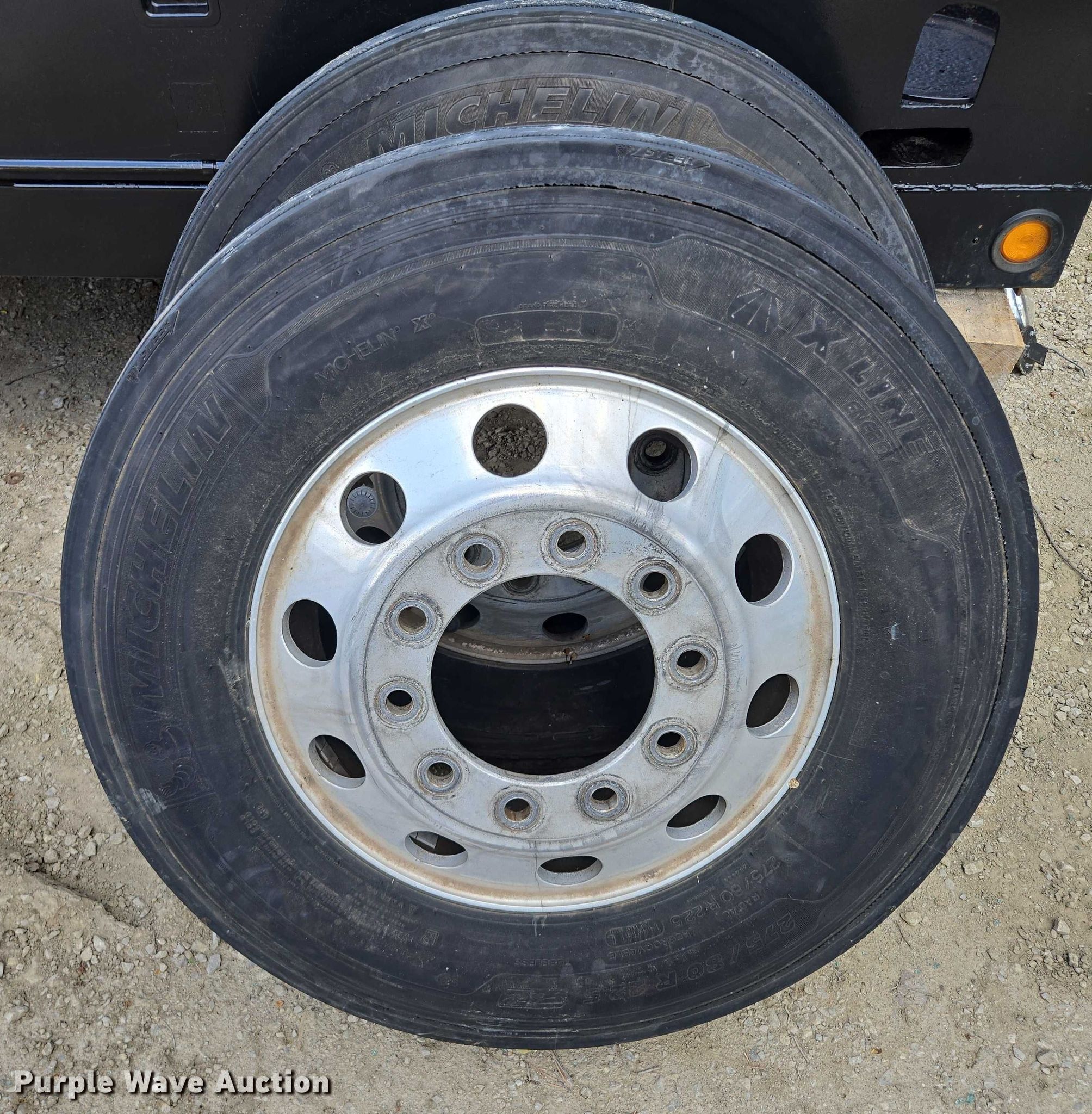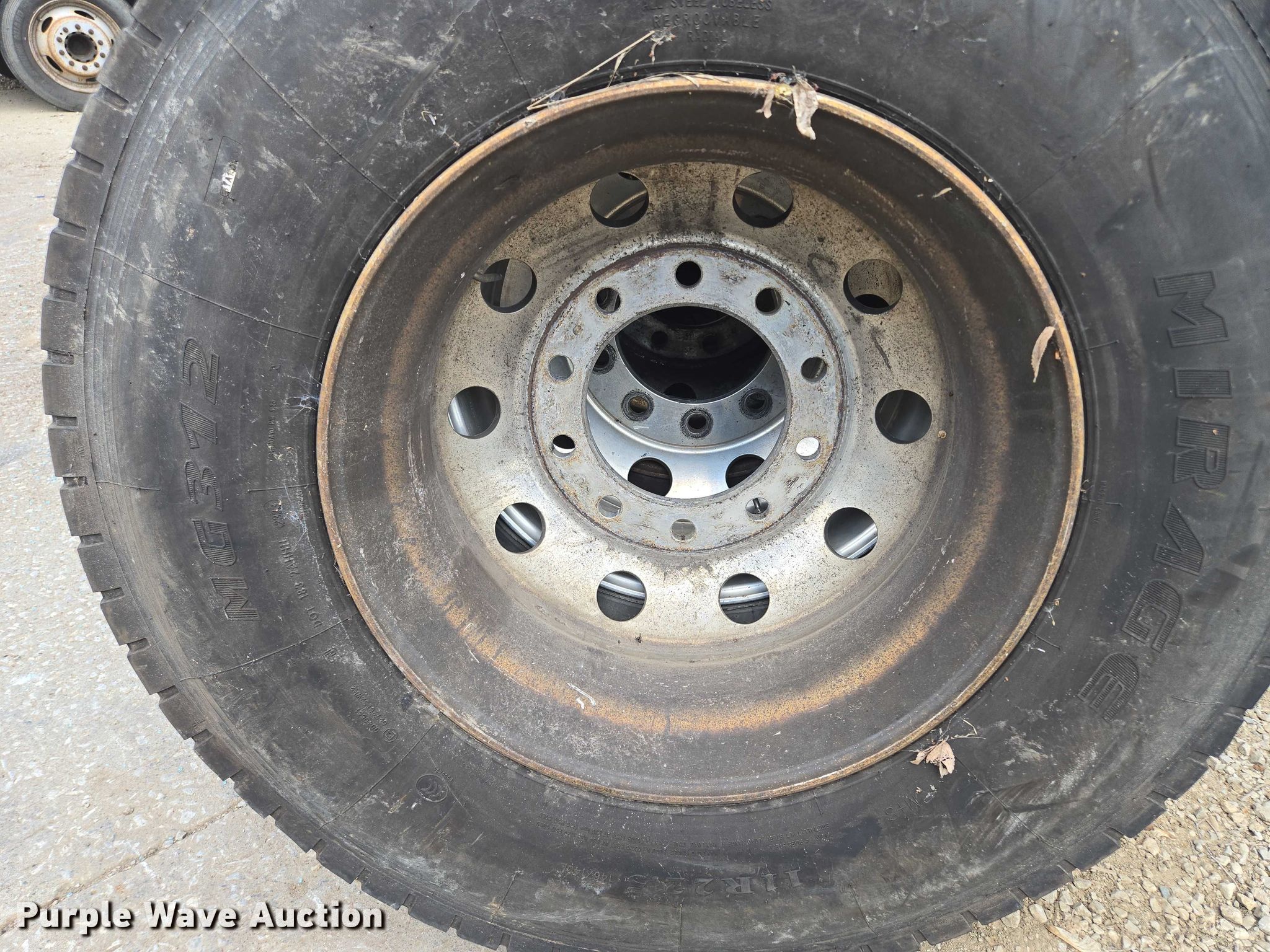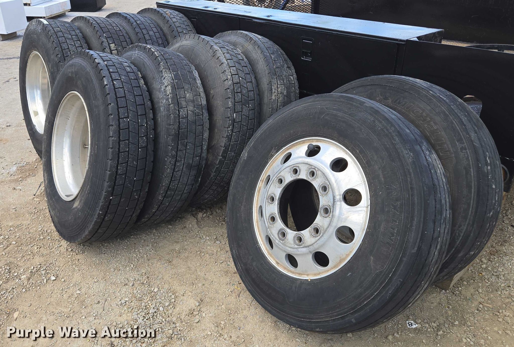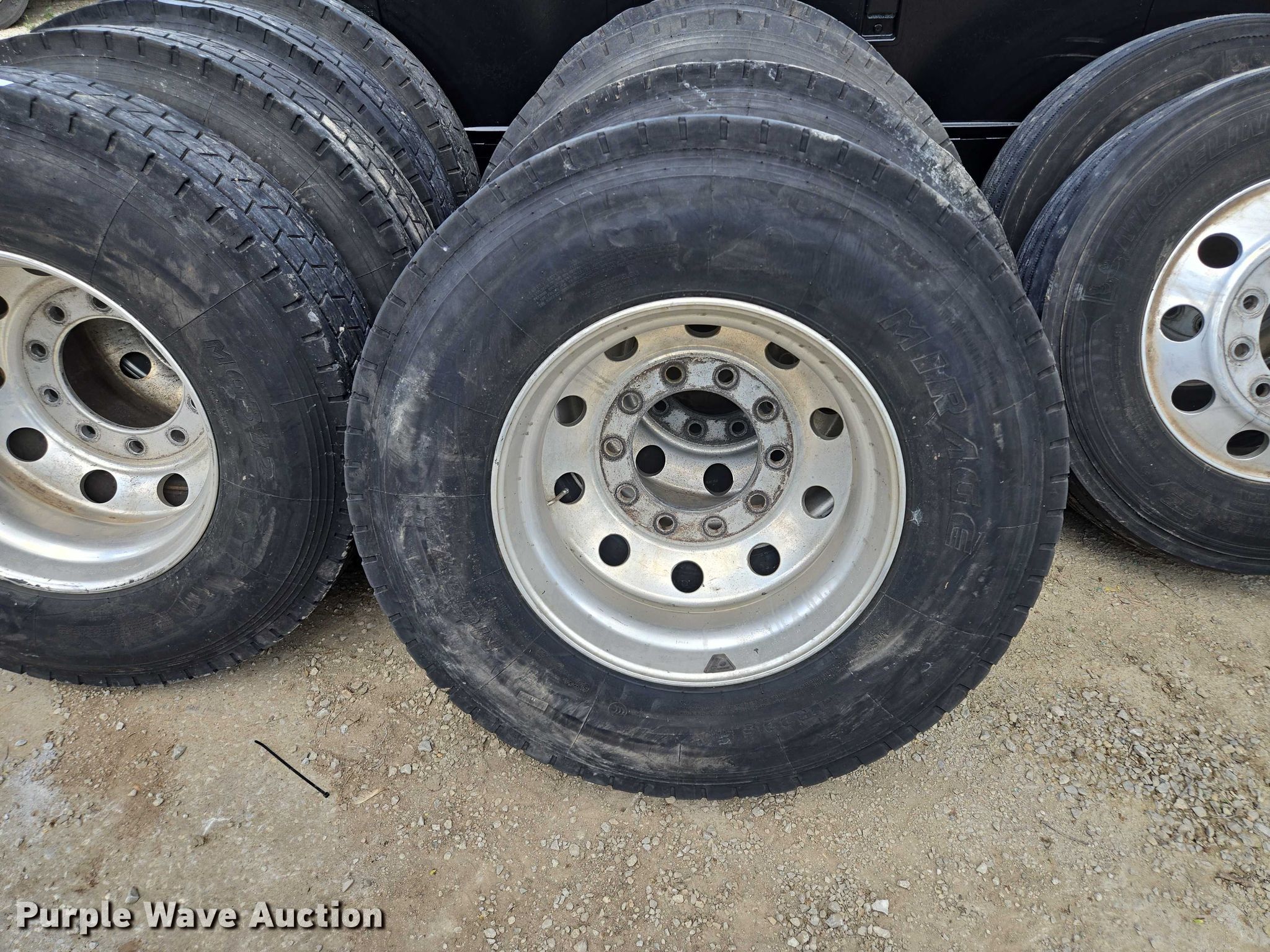 Purple Wave is selling a used Industrial Tires or Tracks in Missouri. This item is a (10) tires and wheels with the following: (8) aluminum, (6) 11R22.5, (2) 275/80R225, (2) steel, 11R22.5