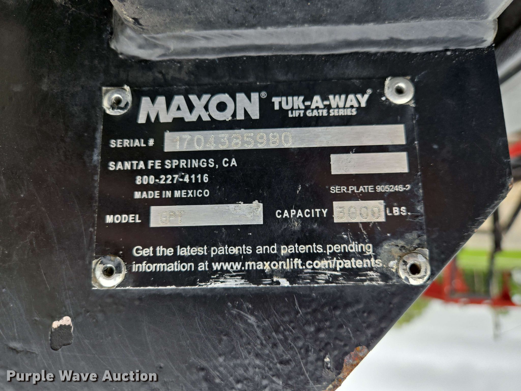 Maxon GPT end gate lift. Serial: 1704385980. Features Length: 40", Width: 89". Notes Truck frame welded to lift. Sprouls Construction Inc... Lamar, MO 64759