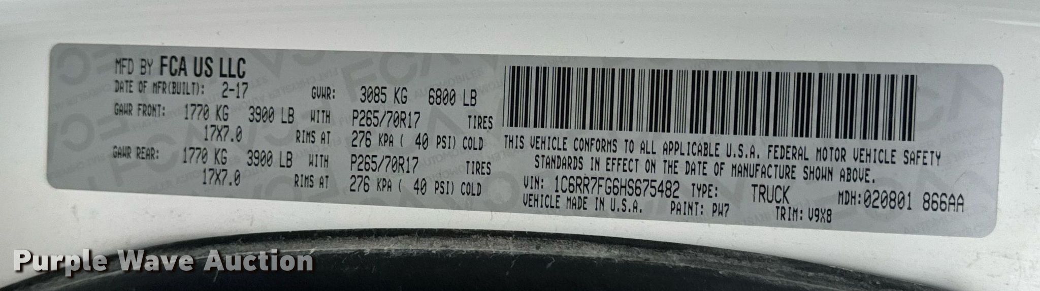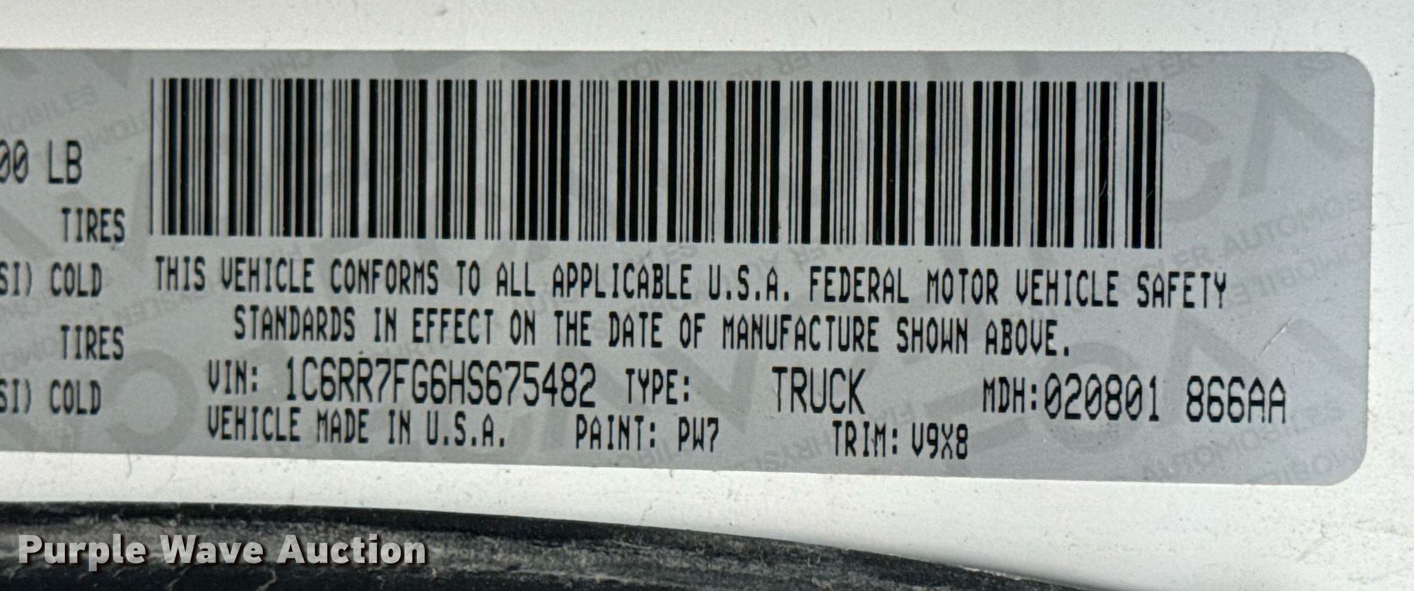 Purple Wave is selling a used 1/2 Ton Pickup or Van in Missouri. This item is a 2017 Dodge Ram 1500 Quad Cab pickup truck with the following: Miles: 188,293 on odometer, Hours: 1,188 on meter, VIN: 1C6RR7FG6HS675482