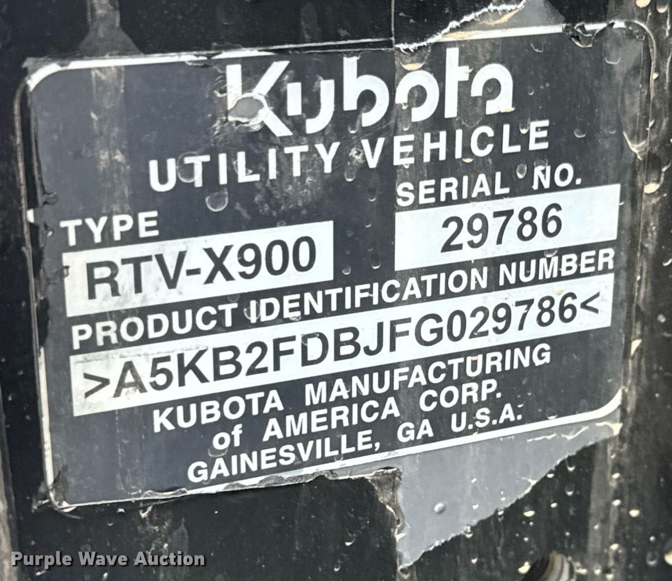 Purple Wave is selling a used Utility Vehicle in Oklahoma. This item is a 2015 Kubota RTV-X900 utility vehicle with the following: Miles: 66,000 on odometer, Hours: 14,537 on meter, VIN: A5KB2FDBJFG029786, Serial: 29786