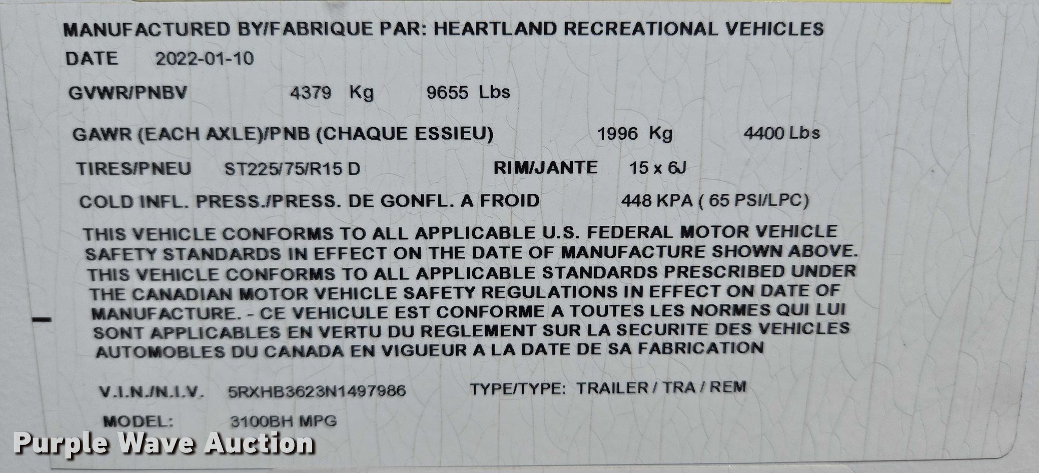 Purple Wave is selling a used RV or Camper in South Dakota. This item is a 2022 Heartland 3100BH MPG camper with the following: Camper length: 36' 8", VIN: 5RXHB3623N1497986, Unit #: C3-25