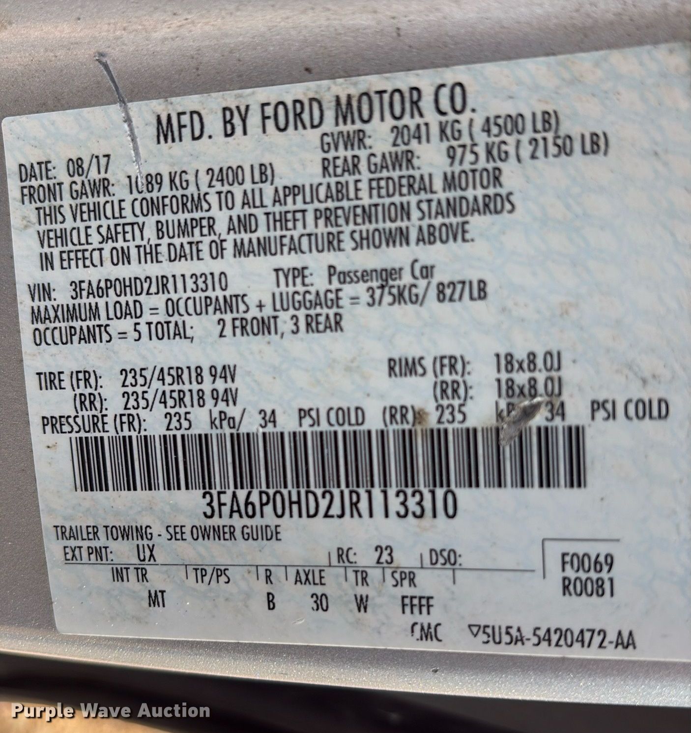 Purple Wave is selling a used Passenger Vehicle in Oklahoma. This item is a 2018 Ford Fusion with the following: Miles: 148,788 on odometer, VIN: 3FA6P0HD2JR113310
