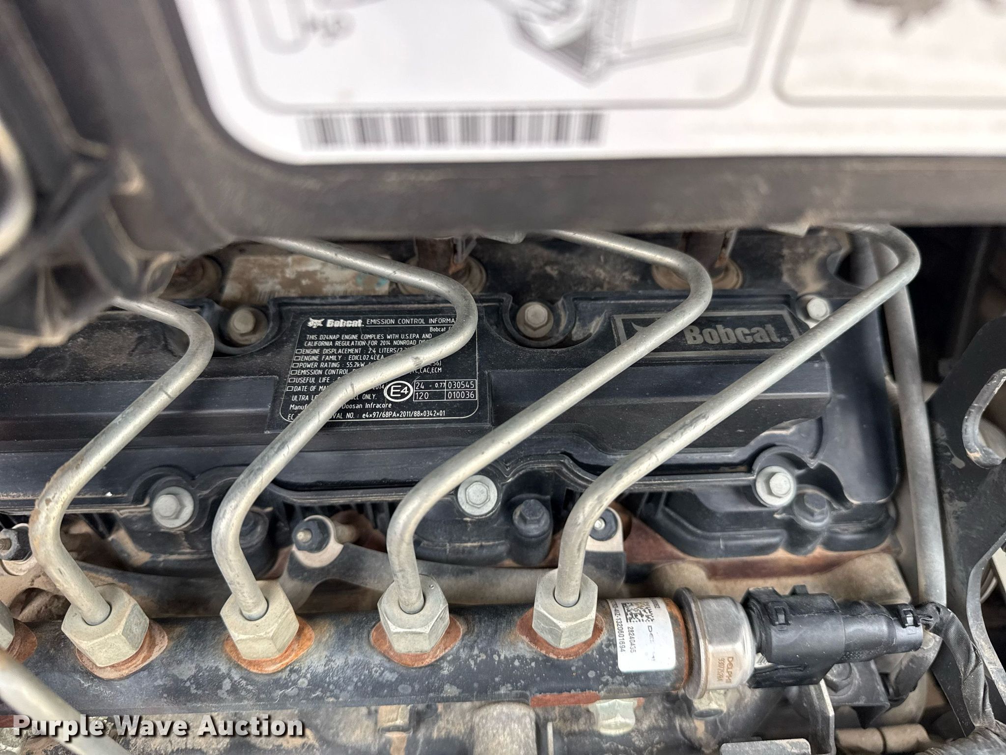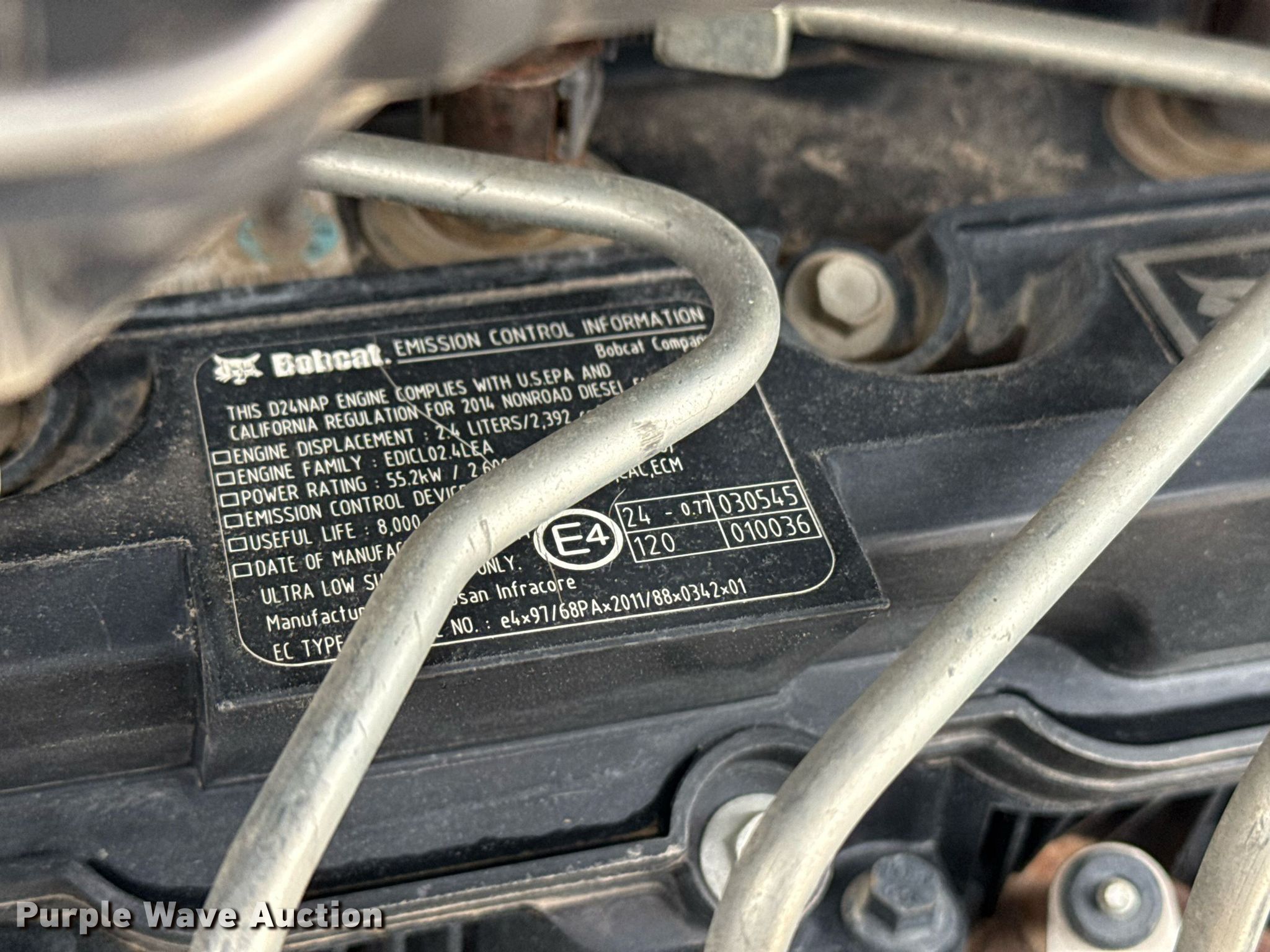 2014 Bobcat T650 tracked skid steer loader. Hours: 2,735 on meter, Serial: ALJG11396. Engine Bobcat EDICL02LEA, Displacement: 2.4L, Cylinders: 4, Fuel type: Diesel, kW: 55.2. Transmission Hydrostatic, Two speed travel. Operators station Enclosed cab, Heat, Bucket control: Hand, Pattern changer, Electronic Monitoring System panel. Features Auxiliary hydraulics, Auxiliary electrical outlet, Quick coupler: Hydraulic, Bucket Width: 80", Low profile, Cutting edge: Bolt-on. Tracks Width: 18". TLS, LLC. Tulsa, OK 74107
